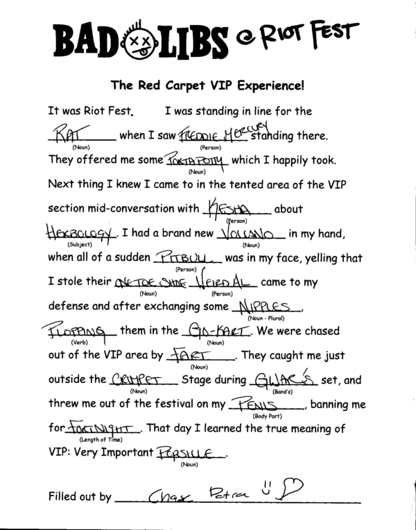 Bad Copy’s infamous BAD LIBS are back to help Riot Fest celebrate their 20th anniversary! Our Bad Copy team spent the music-packed weekend running rampant all over Douglass Park in Chicago watching bands and then sprinting back to the Press Area for round after round of one of our favorite nostalgic games!