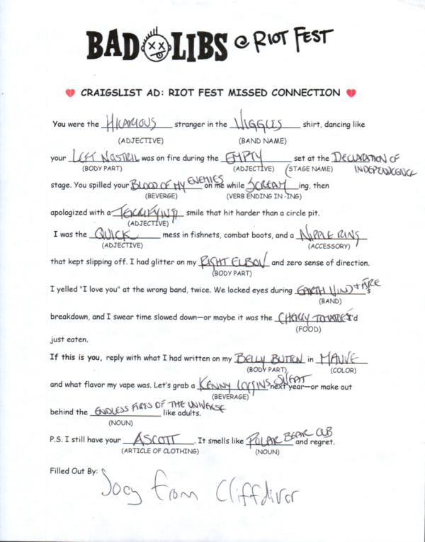 Bad Copy’s infamous BAD LIBS are back to help Riot Fest celebrate their 20th anniversary! Our Bad Copy team spent the music-packed weekend running rampant all over Douglass Park in Chicago watching bands and then sprinting back to the Press Area for round after round of one of our favorite nostalgic games!
