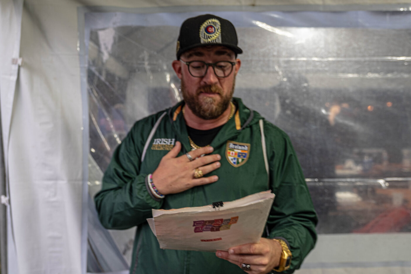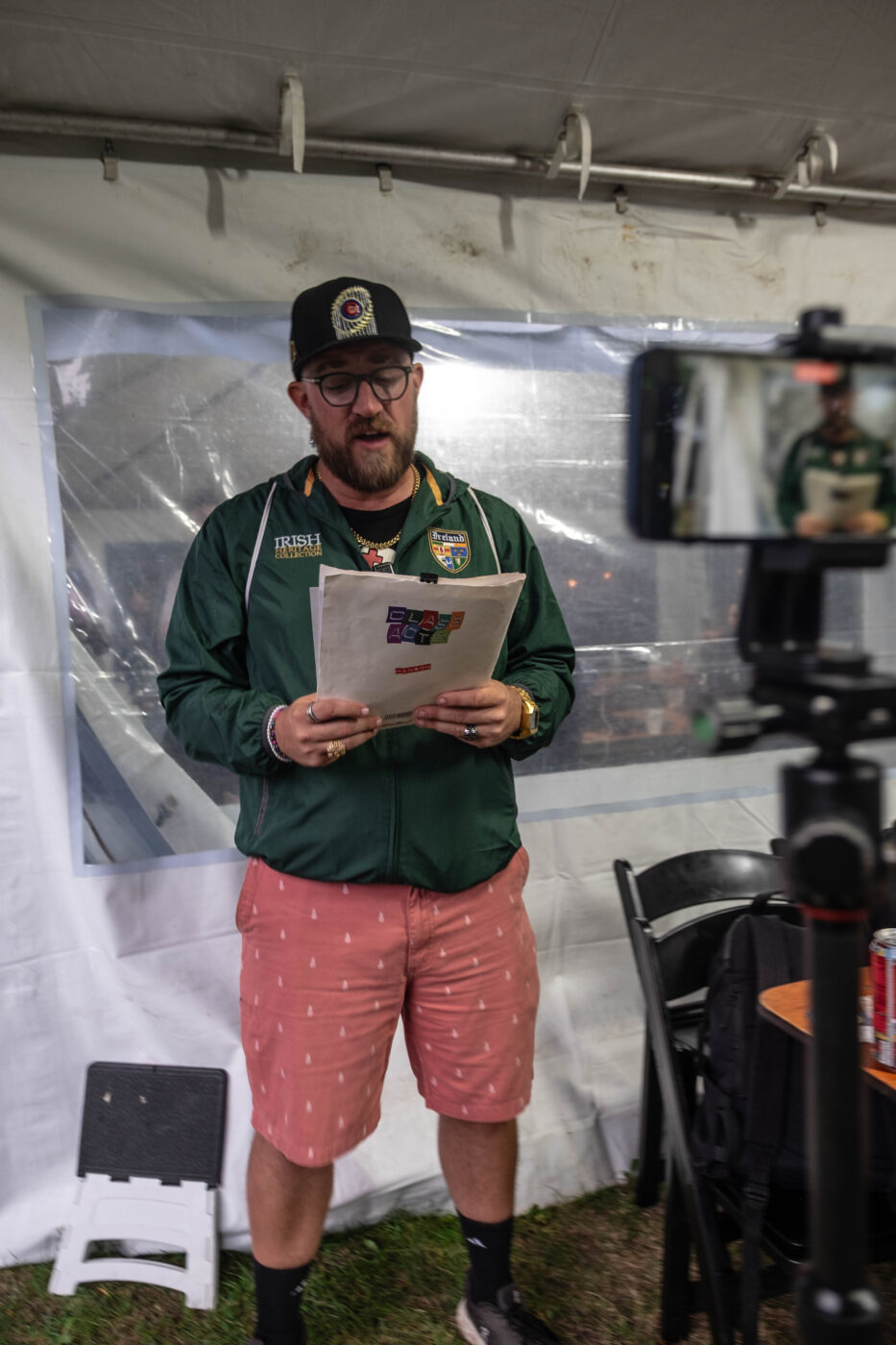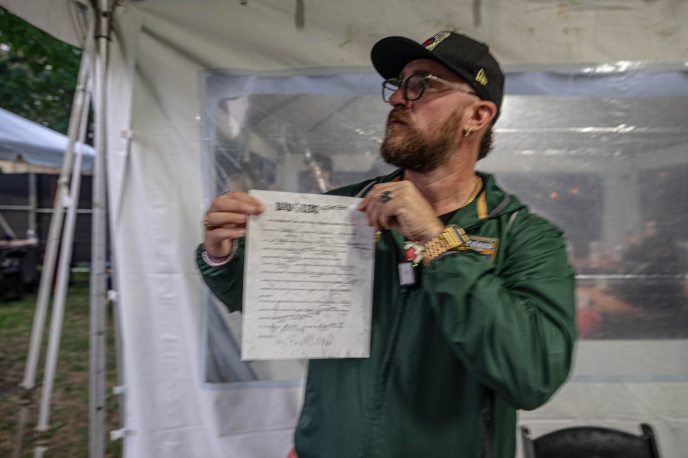 And, of course, here’s a few photos of him combating the rain and reading it in the Press Tent: