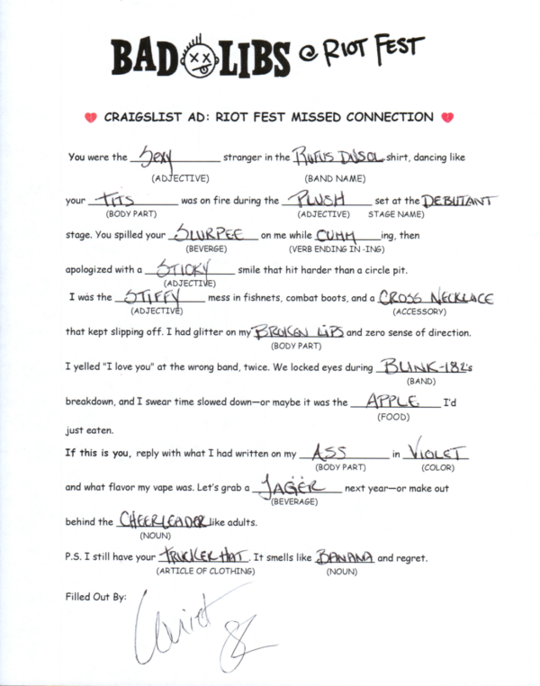 Bad Copy’s infamous BAD LIBS are back to help Riot Fest celebrate their 20th anniversary! Our Bad Copy team spent the music-packed weekend running rampant all over Douglass Park in Chicago watching bands and then sprinting back to the Press Area for round after round of one of our favorite nostalgic games!