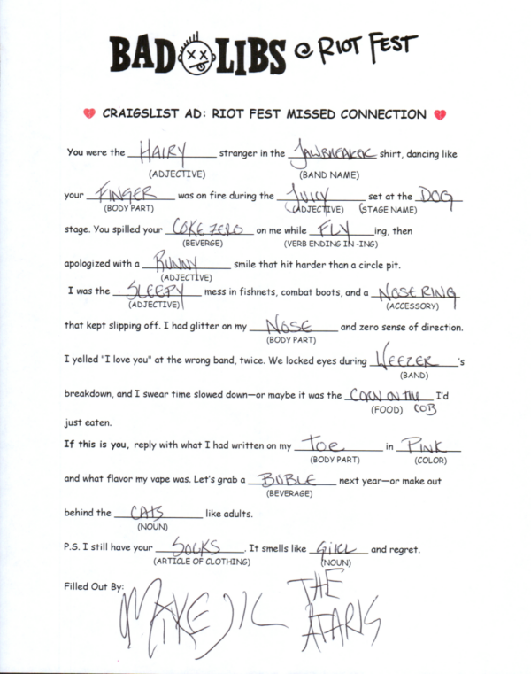 Bad Copy’s infamous BAD LIBS are back to help Riot Fest celebrate their 20th anniversary! Our Bad Copy team spent the music-packed weekend running rampant all over Douglass Park in Chicago watching bands and then sprinting back to the Press Area for round after round of one of our favorite nostalgic games!
