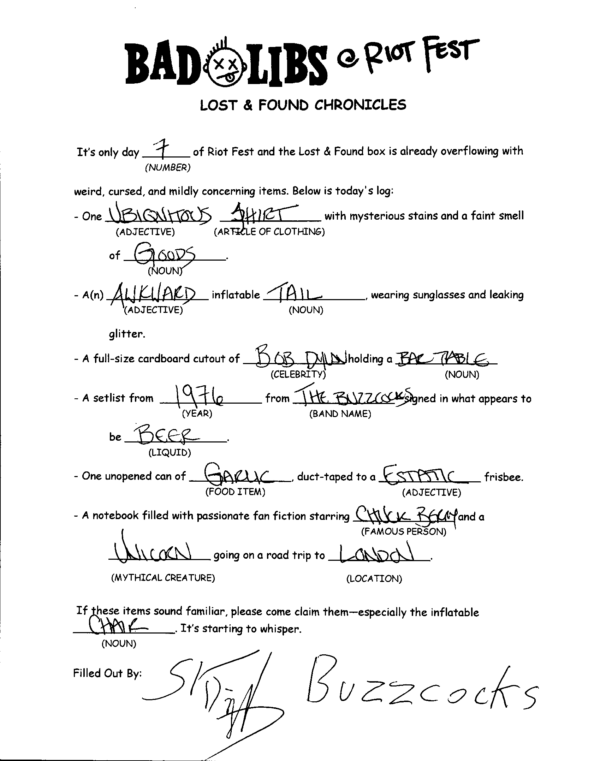 Bad Copy’s infamous BAD LIBS are back to help Riot Fest celebrate their 20th anniversary! Our Bad Copy team spent the music-packed weekend running rampant all over Douglass Park in Chicago watching bands and then sprinting back to the Press Area for round after round of one of our favorite nostalgic games!
