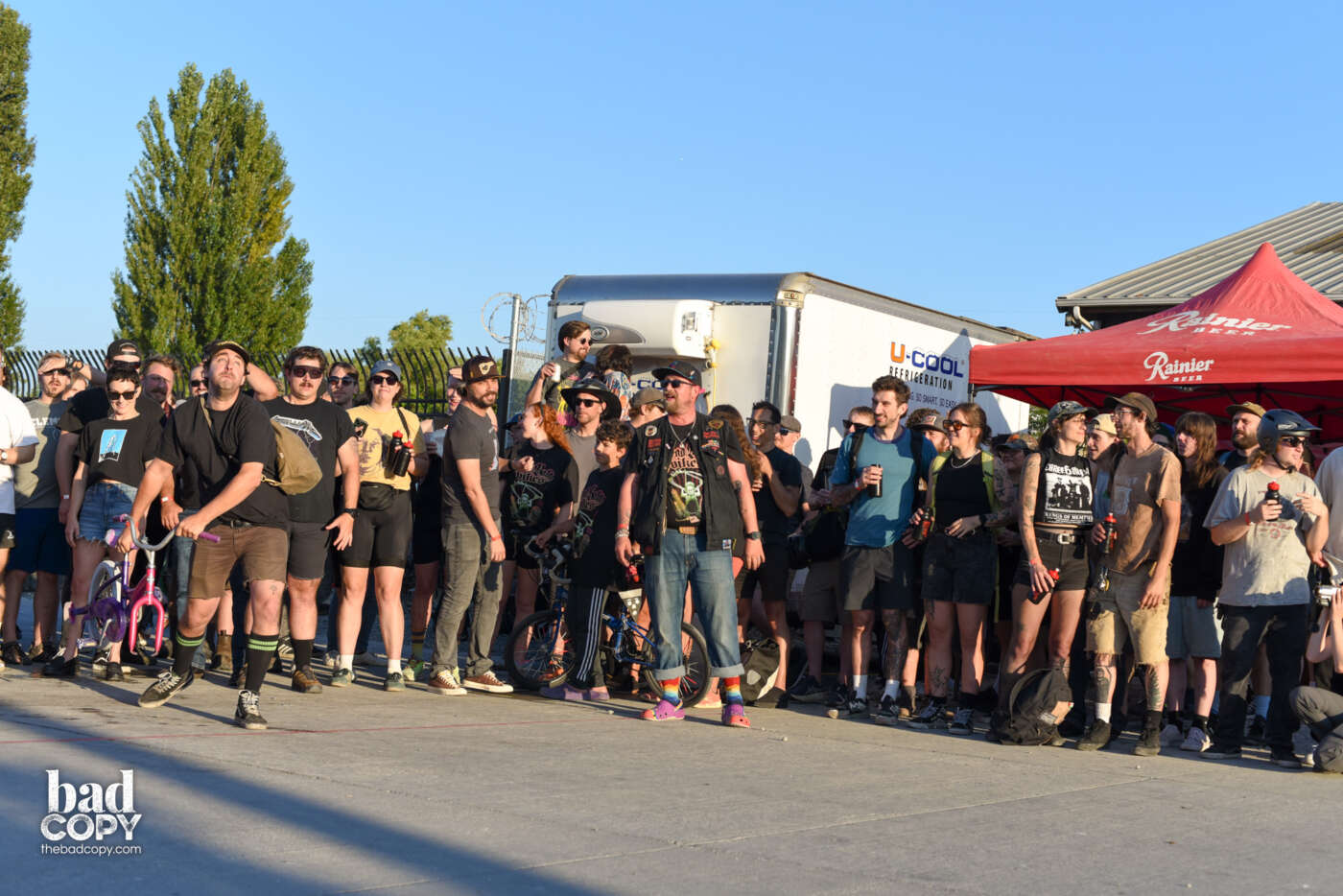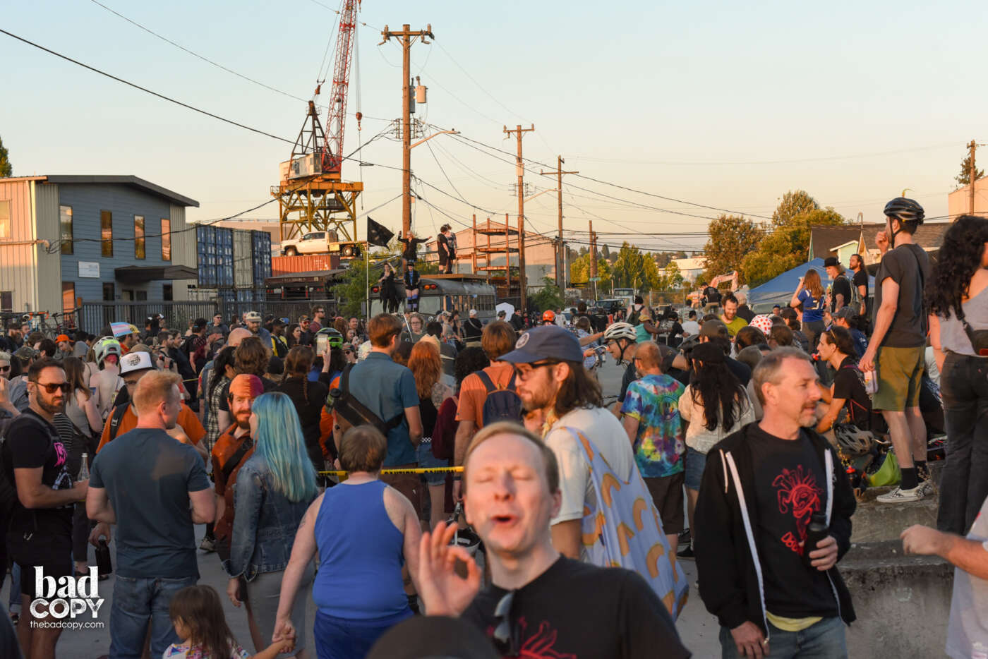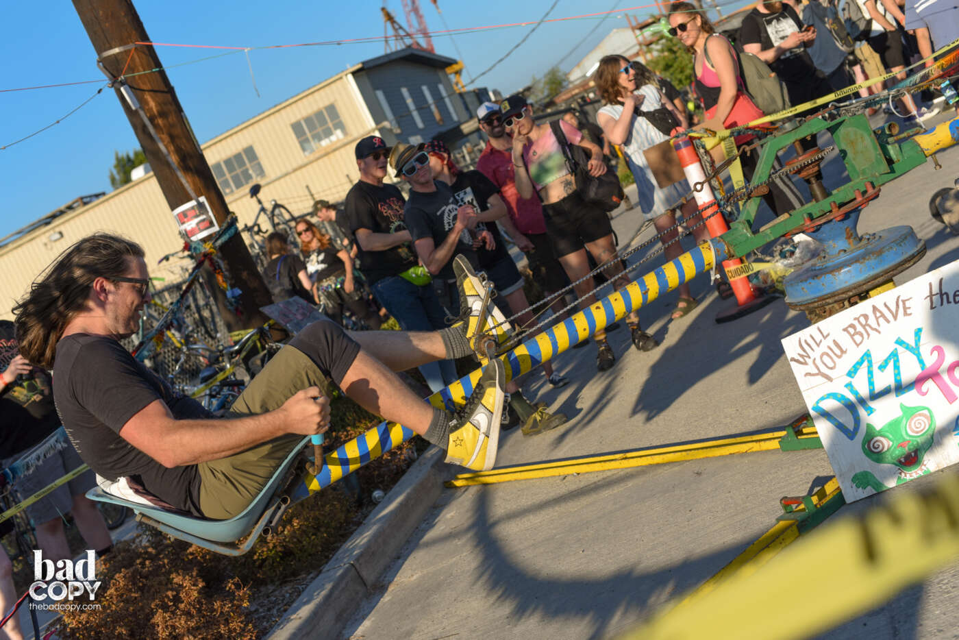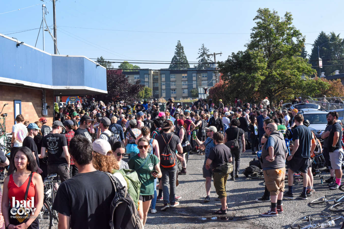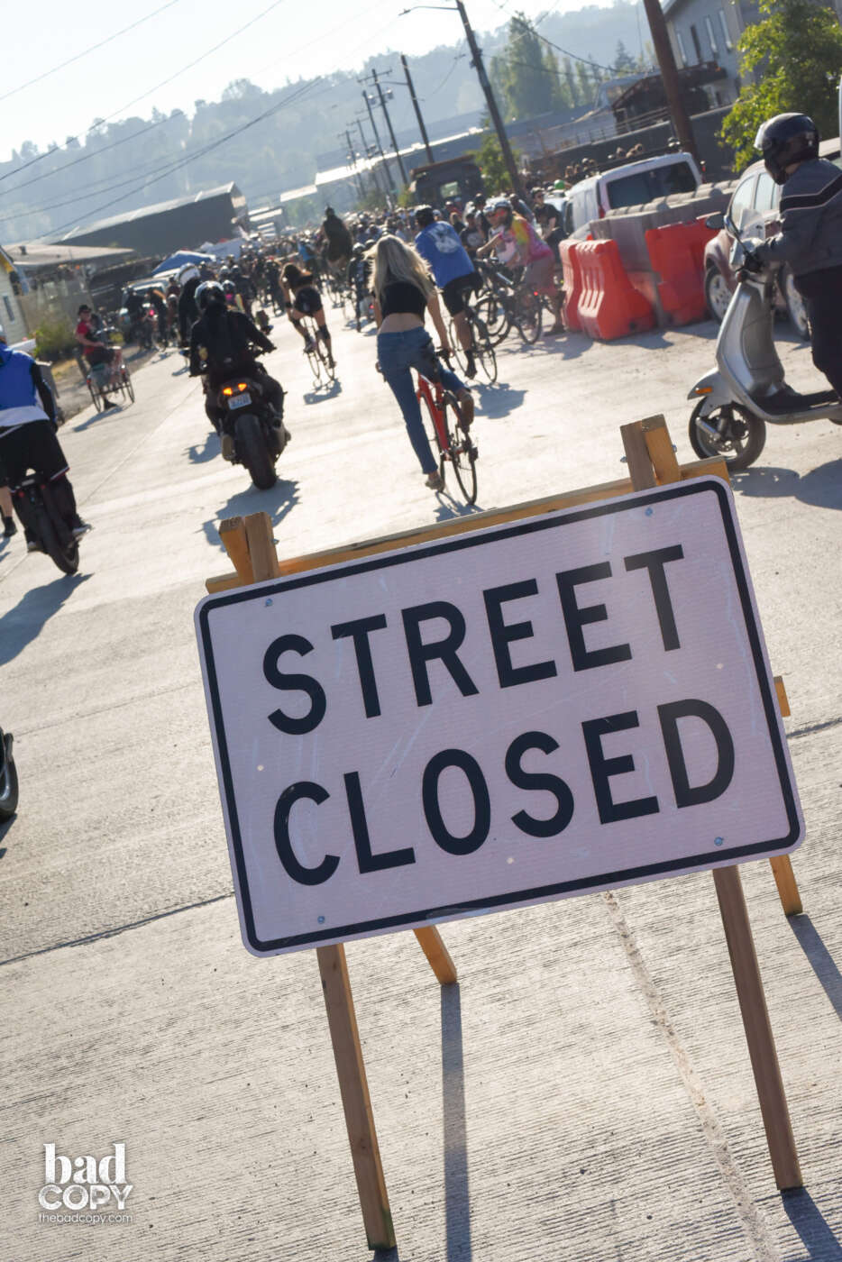 Once the hill was sufficiently bombed, I joined in on a leisurely cruise with the rest of the racers through the South Park neighborhood towards the industrial park that would be the backdrop to one of the wildest parties I’ve witnessed in my time here on earth. As I mentioned before when I registered, I received a t-shirt and a water bottle. Sadly, in the midst of my pursuit for speed, that sick t-shirt that I had foolishly hung around my sling bag was whisked away by the downhill winds. As much as I wanted to stop and retrieve it, I would have been a mangled mess with handlebars through my neck if I stopped in the middle of the ride. Most importantly however, I held on to my water bottle. The incentive for this staying on your person and making it to the end of the ride was – believe it or not – UNLIMITED BEER. As long as you brought that bottle to the beer tent, they’d fill it as many times as you’d like. The tip jar was all being donated to The People’s Harm Reduction Alliance, a local non-profit, so we all felt a little better about how many trips we were making to the big red tent with the Rainier “R” printed on the front.