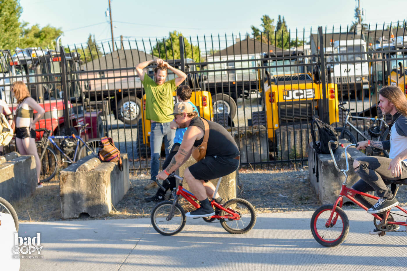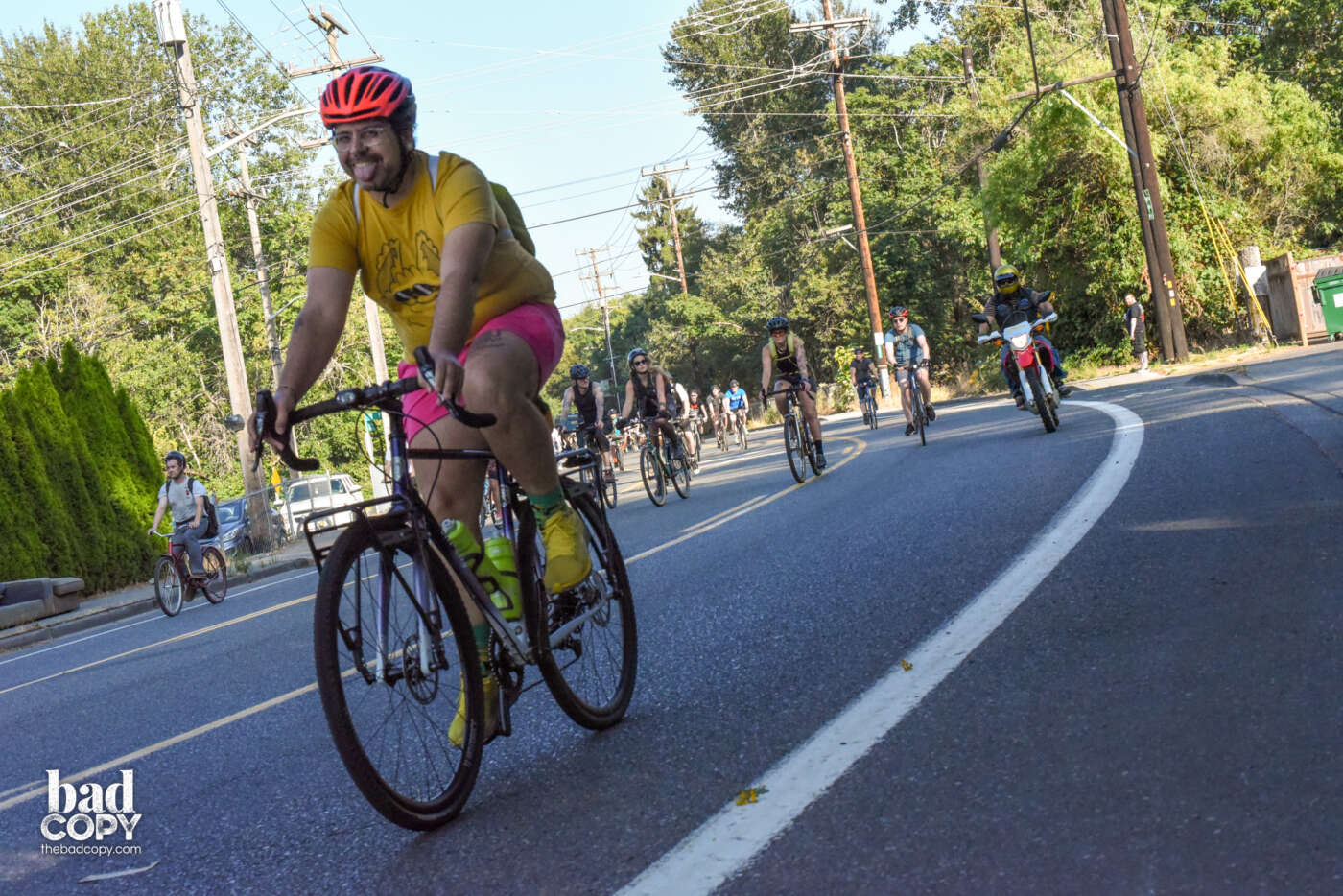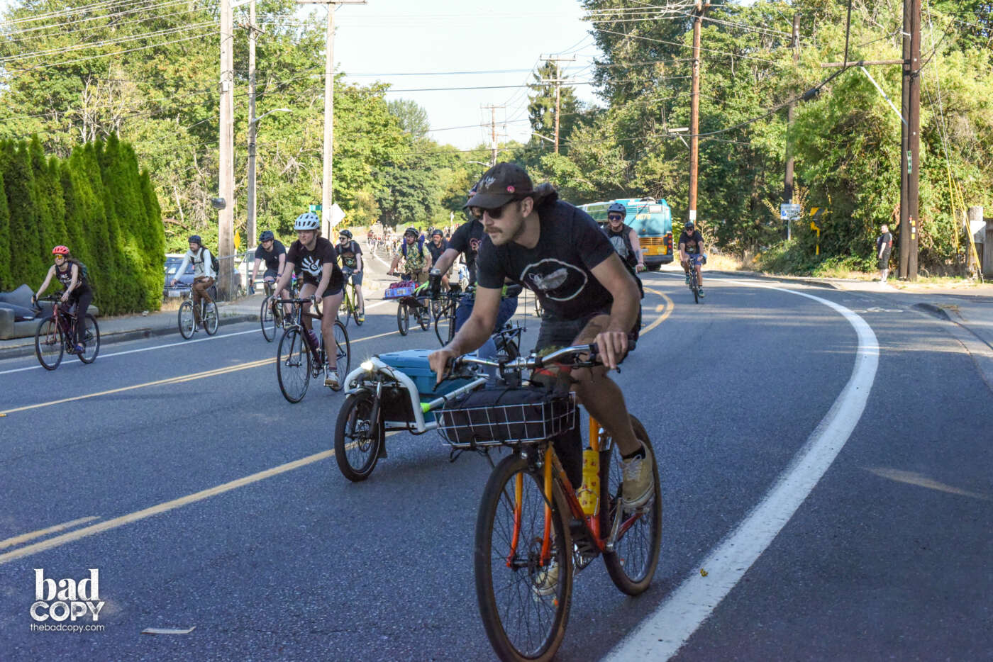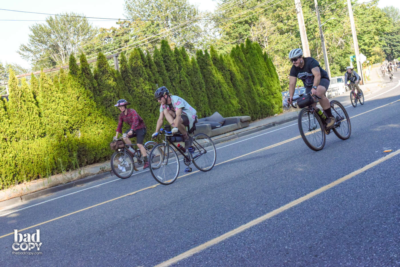 Once the hill was sufficiently bombed, I joined in on a leisurely cruise with the rest of the racers through the South Park neighborhood towards the industrial park that would be the backdrop to one of the wildest parties I’ve witnessed in my time here on earth. As I mentioned before when I registered, I received a t-shirt and a water bottle. Sadly, in the midst of my pursuit for speed, that sick t-shirt that I had foolishly hung around my sling bag was whisked away by the downhill winds. As much as I wanted to stop and retrieve it, I would have been a mangled mess with handlebars through my neck if I stopped in the middle of the ride. Most importantly however, I held on to my water bottle. The incentive for this staying on your person and making it to the end of the ride was – believe it or not – UNLIMITED BEER. As long as you brought that bottle to the beer tent, they’d fill it as many times as you’d like. The tip jar was all being donated to The People’s Harm Reduction Alliance, a local non-profit, so we all felt a little better about how many trips we were making to the big red tent with the Rainier “R” printed on the front.