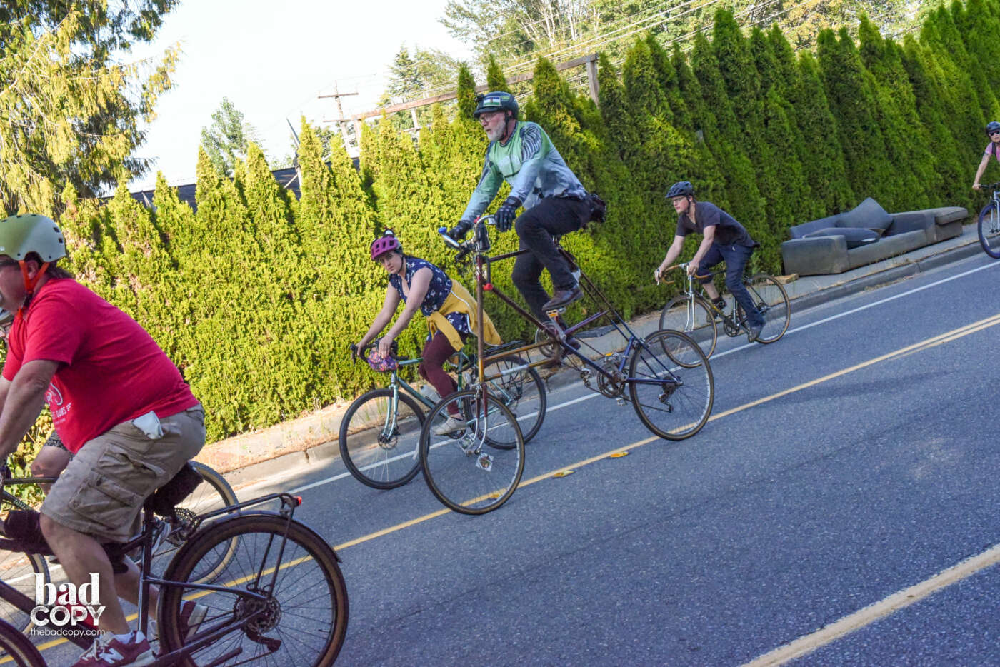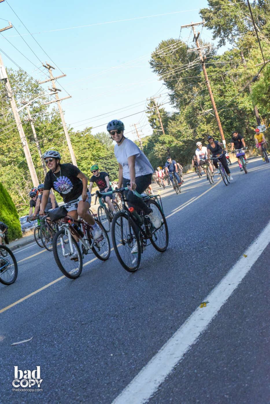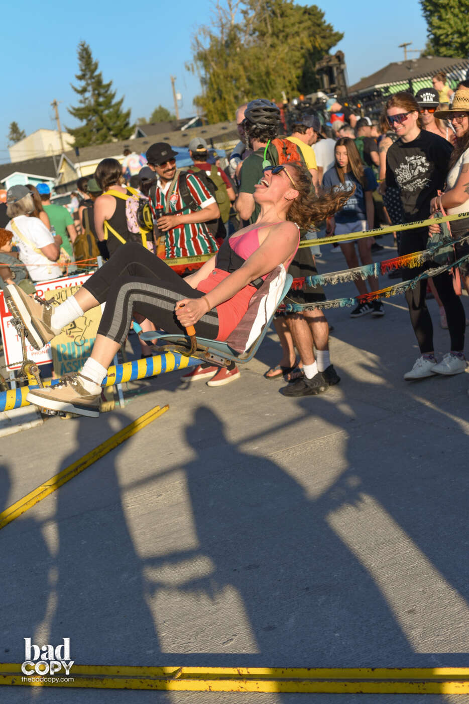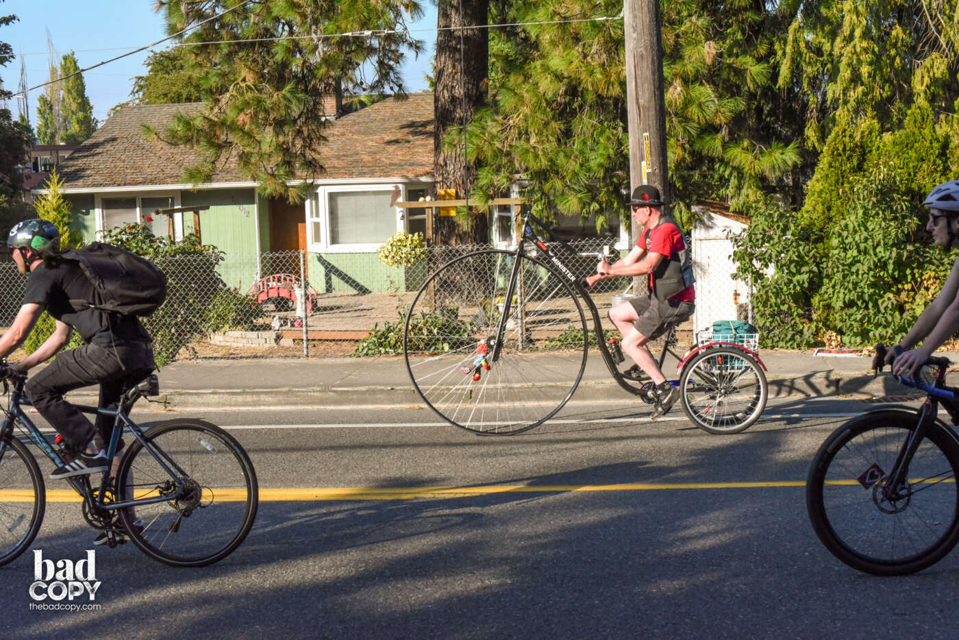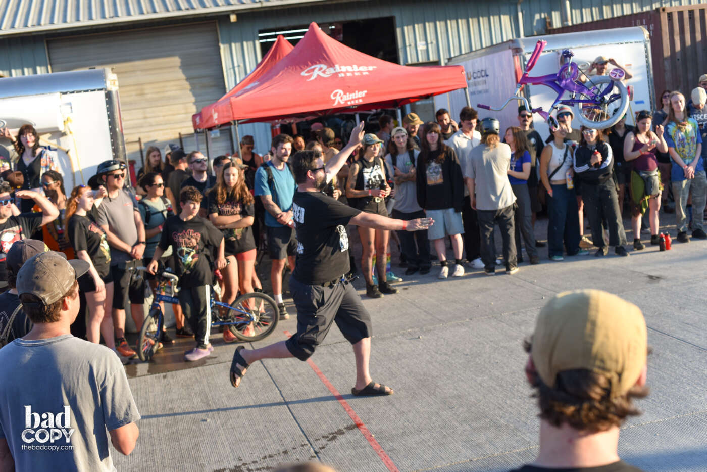 Once the hill was sufficiently bombed, I joined in on a leisurely cruise with the rest of the racers through the South Park neighborhood towards the industrial park that would be the backdrop to one of the wildest parties I’ve witnessed in my time here on earth. As I mentioned before when I registered, I received a t-shirt and a water bottle. Sadly, in the midst of my pursuit for speed, that sick t-shirt that I had foolishly hung around my sling bag was whisked away by the downhill winds. As much as I wanted to stop and retrieve it, I would have been a mangled mess with handlebars through my neck if I stopped in the middle of the ride. Most importantly however, I held on to my water bottle. The incentive for this staying on your person and making it to the end of the ride was – believe it or not – UNLIMITED BEER. As long as you brought that bottle to the beer tent, they’d fill it as many times as you’d like. The tip jar was all being donated to The People’s Harm Reduction Alliance, a local non-profit, so we all felt a little better about how many trips we were making to the big red tent with the Rainier “R” printed on the front.