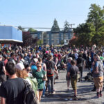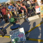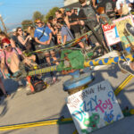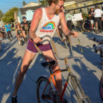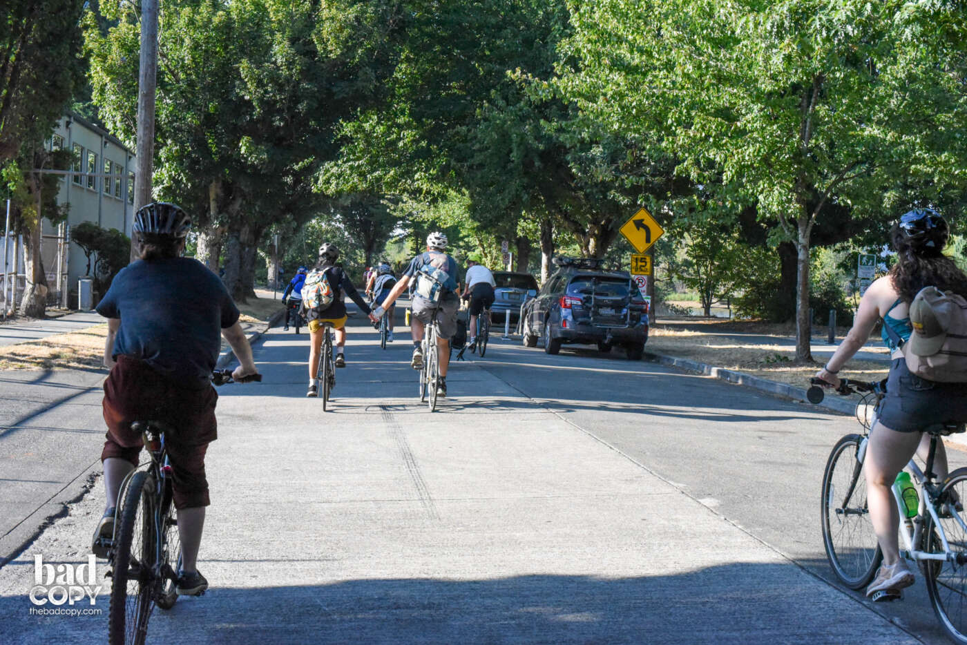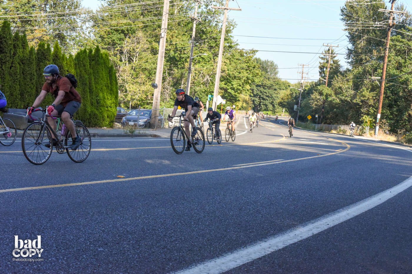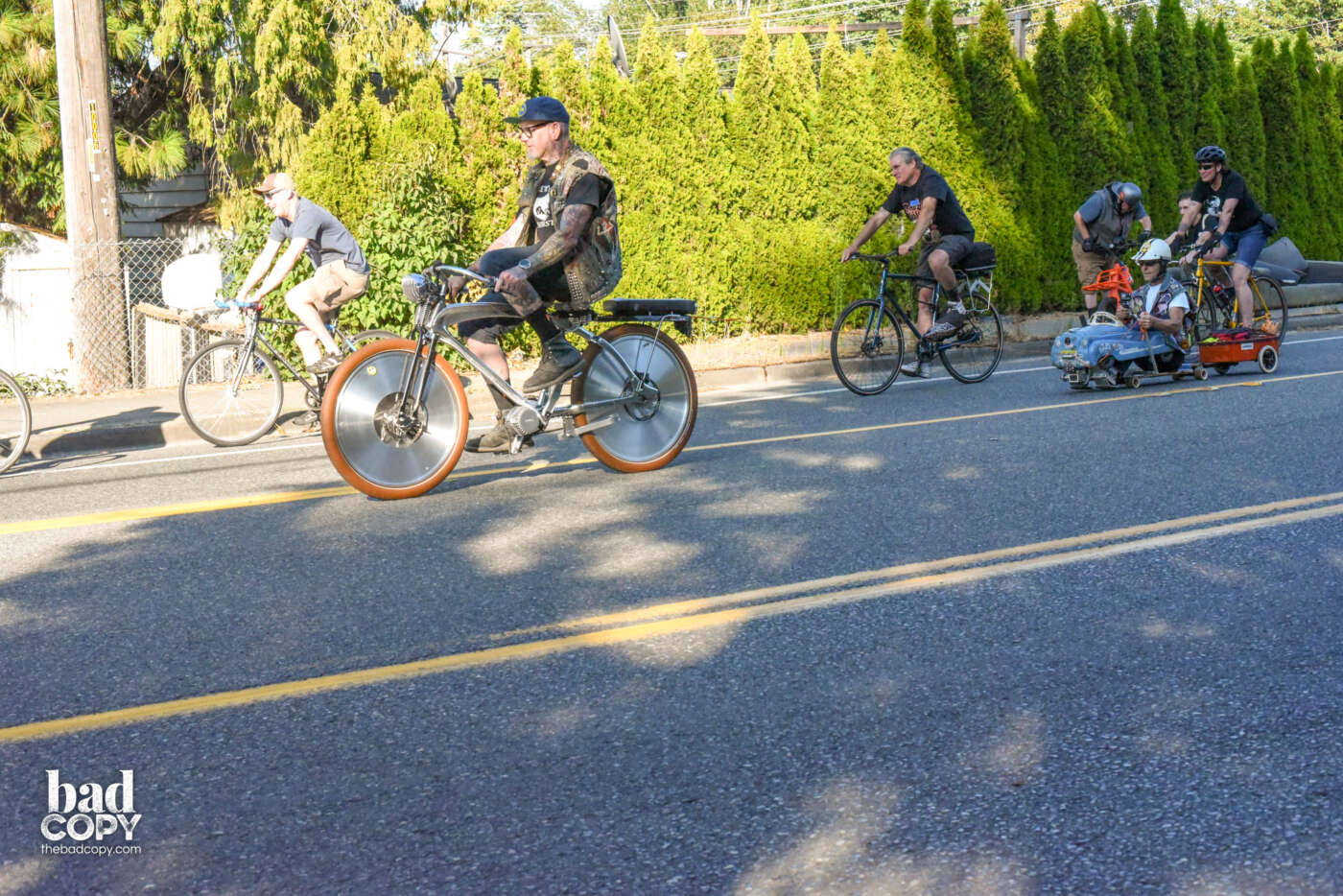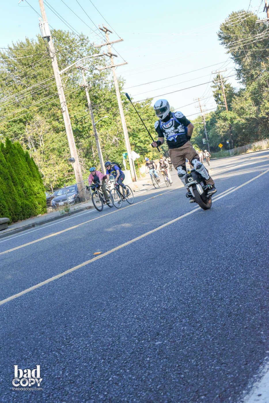 Once the hill was sufficiently bombed, I joined in on a leisurely cruise with the rest of the racers through the South Park neighborhood towards the industrial park that would be the backdrop to one of the wildest parties I’ve witnessed in my time here on earth. As I mentioned before when I registered, I received a t-shirt and a water bottle. Sadly, in the midst of my pursuit for speed, that sick t-shirt that I had foolishly hung around my sling bag was whisked away by the downhill winds. As much as I wanted to stop and retrieve it, I would have been a mangled mess with handlebars through my neck if I stopped in the middle of the ride. Most importantly however, I held on to my water bottle. The incentive for this staying on your person and making it to the end of the ride was – believe it or not – UNLIMITED BEER. As long as you brought that bottle to the beer tent, they’d fill it as many times as you’d like. The tip jar was all being donated to The People’s Harm Reduction Alliance, a local non-profit, so we all felt a little better about how many trips we were making to the big red tent with the Rainier “R” printed on the front.