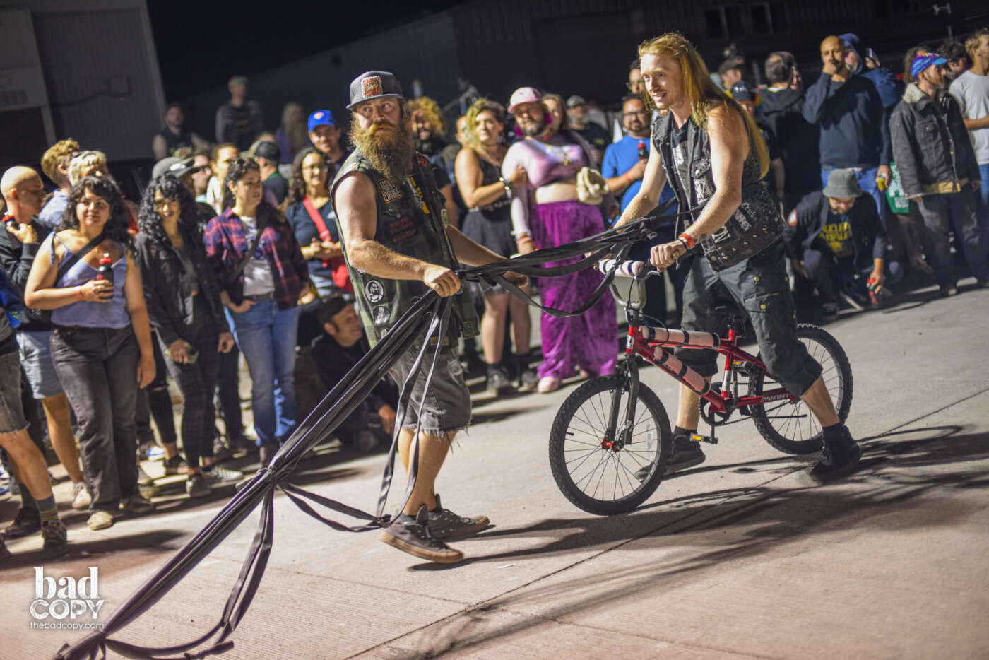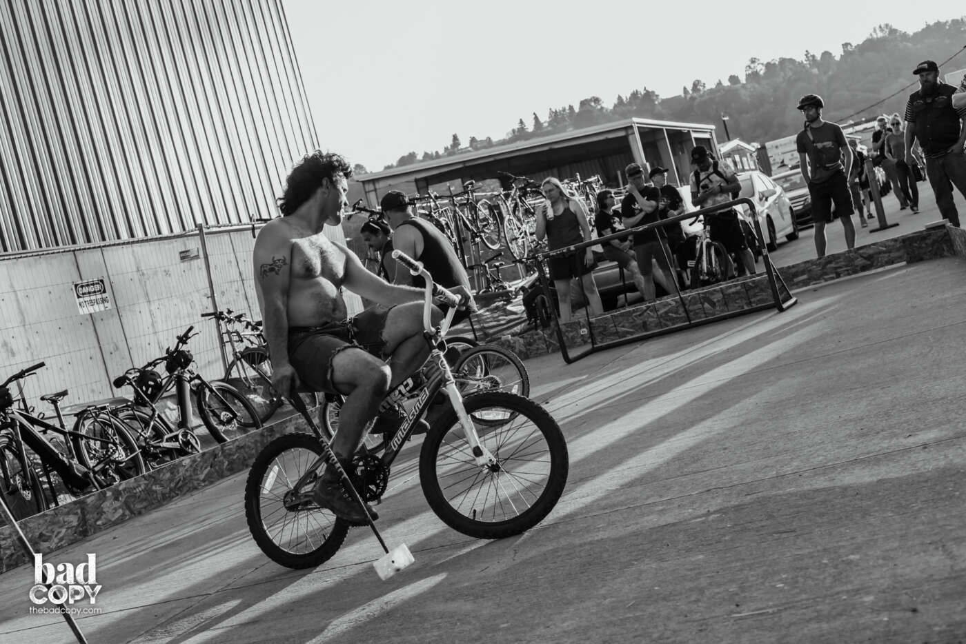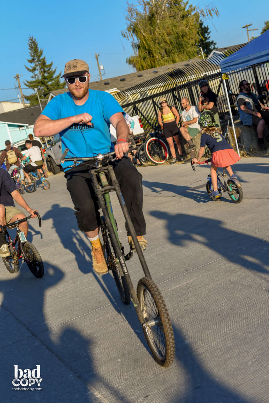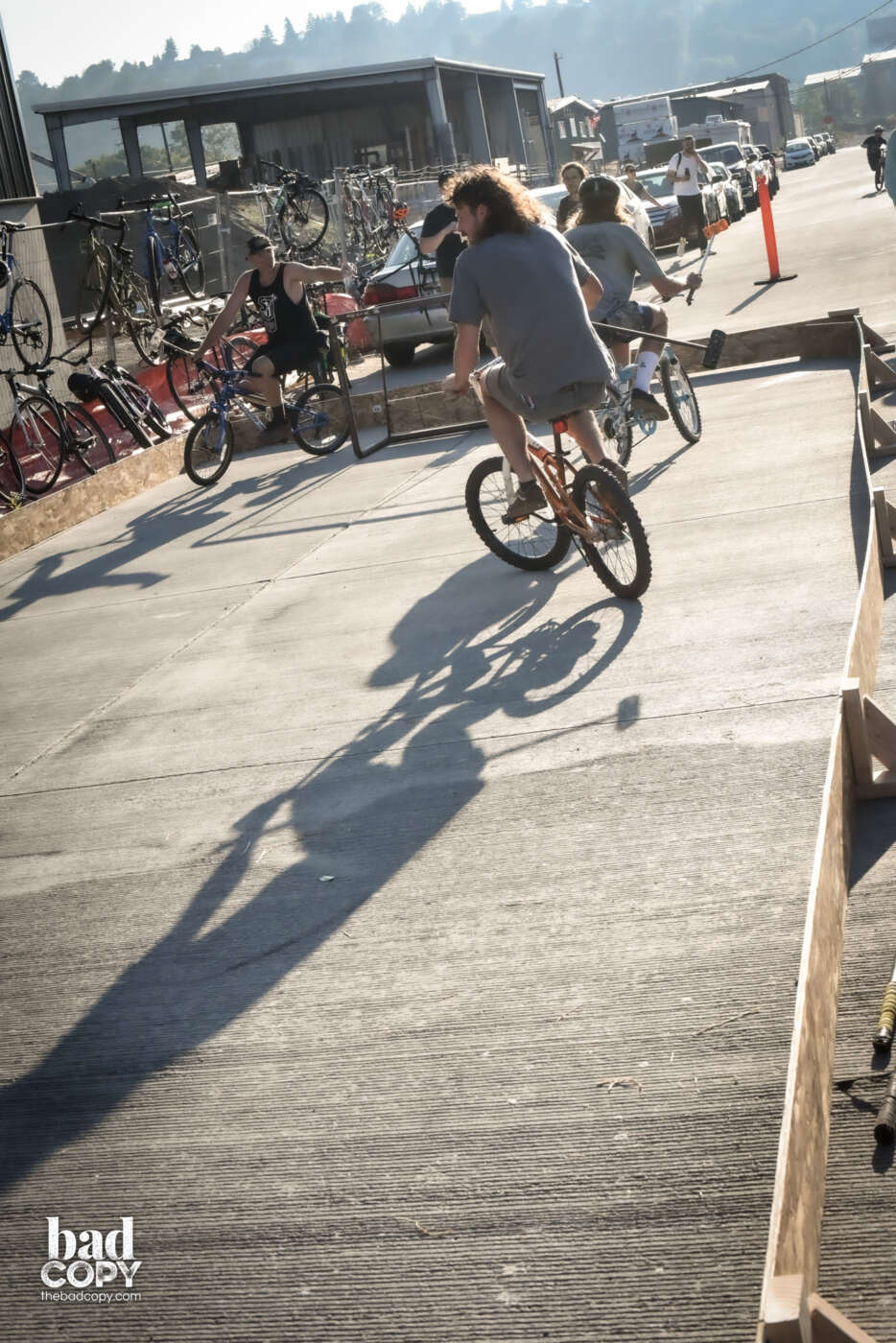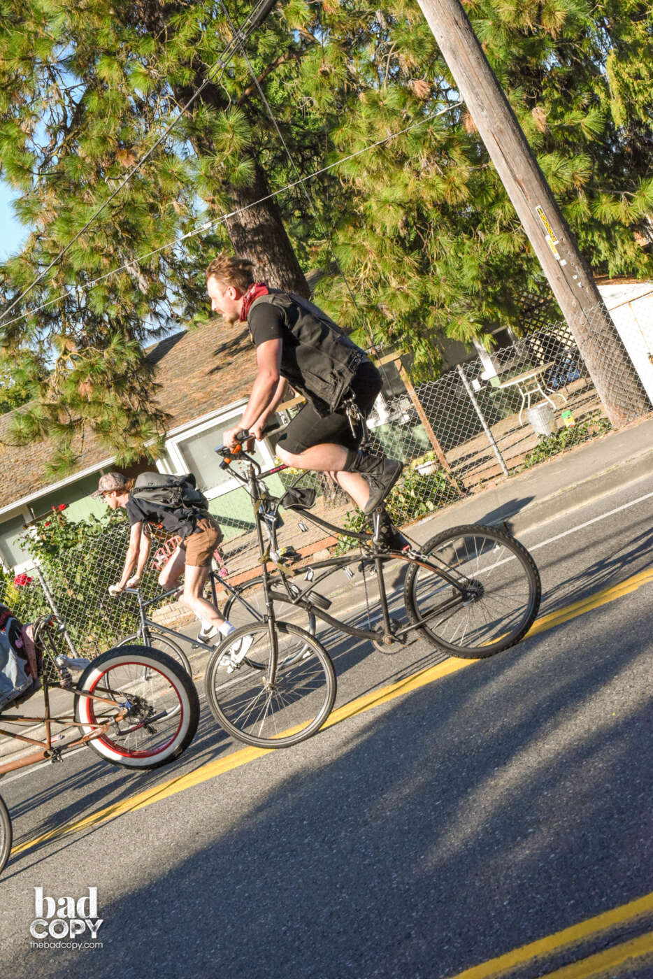 When we got a few Rainiers in us, we decided to walk around the party and check out what all these fellow weirdos were up to. From the moment we were all greeted upon arrival by a local party marching band there was no downtime for the senses. We witnessed high flying dare-devilry at the BMX expo (my favorite to photograph), leisurely yet competitive games of bicycle polo, live music, and when the sun went down the industrial park was graced by multiple fire dancers lighting up the crowd all while being encircled by couples on tandem bicycles. After spending some time in the play pen of custom built wonky bikes, some of which were too tall, others too short, hinged in the middle, and backward pedals we took in what I think was the main attraction of the party, the head-to-head games. Right off the rip we saw a vigorous opening of “save the baby/kill the baby” where a doll is propped up between two contestants facing each other riding at full speed to get there first and it’s one’s job to save the baby, and the other…well you can probably guess. Whoever gets there first has to do their job accordingly. The very first round resulted in what everyone in the crowd assumed to be a concussion or at least a hefty bonk, so from then on helmets were required. Other games included a tug of war where contestants had a length of bike tubes strapped around their shoulders and biked away from each other until there was a clear winner, and the night culminated in the main event of tall bike jousting. Fun for the whole family, really.