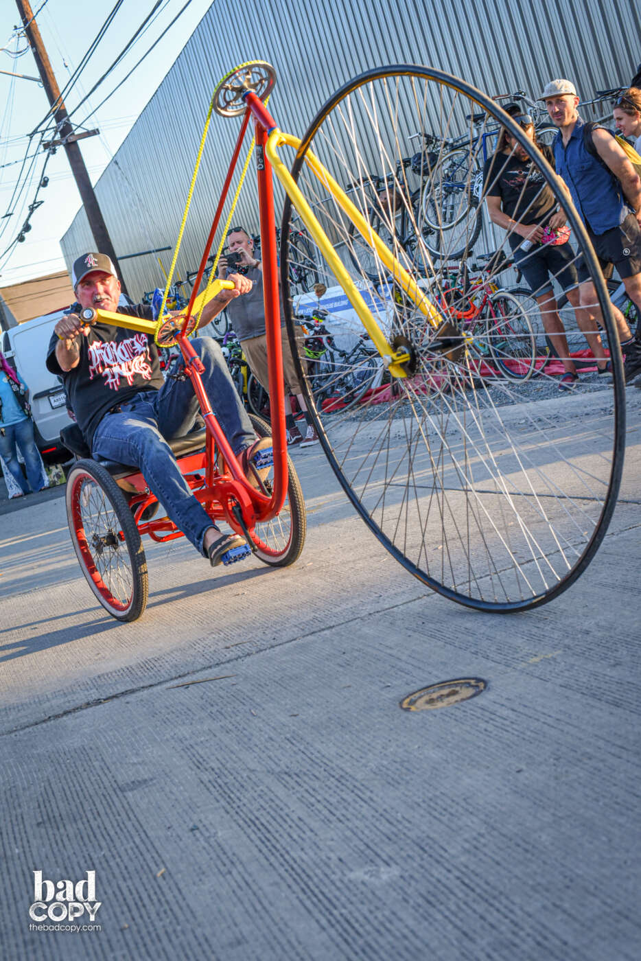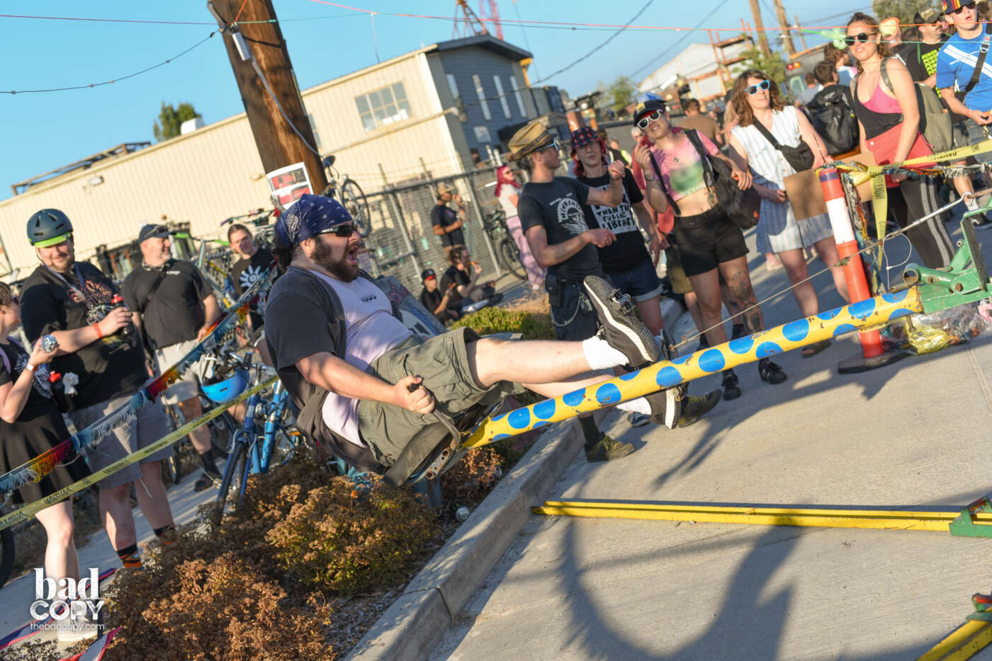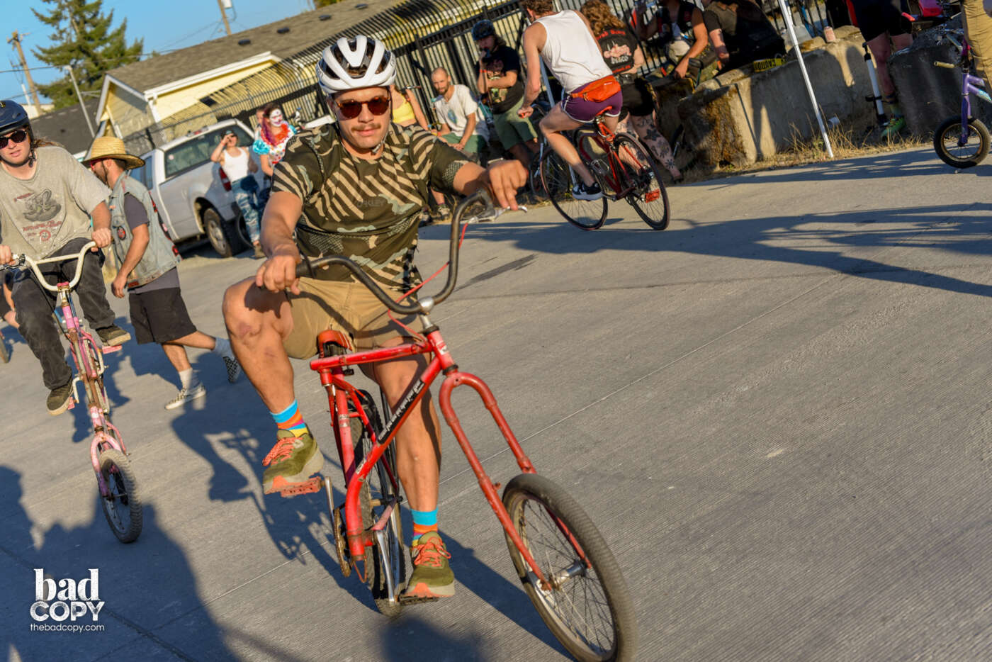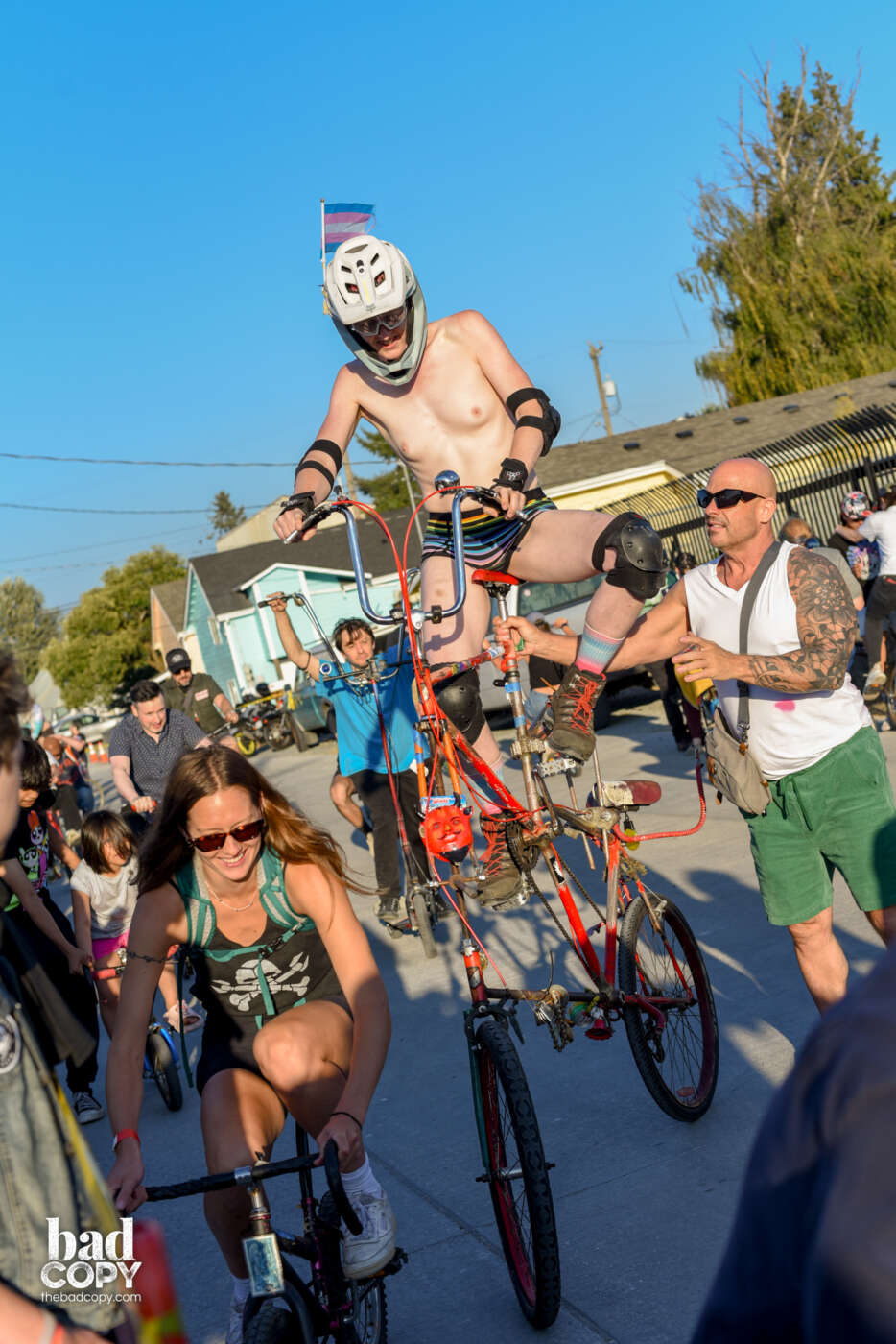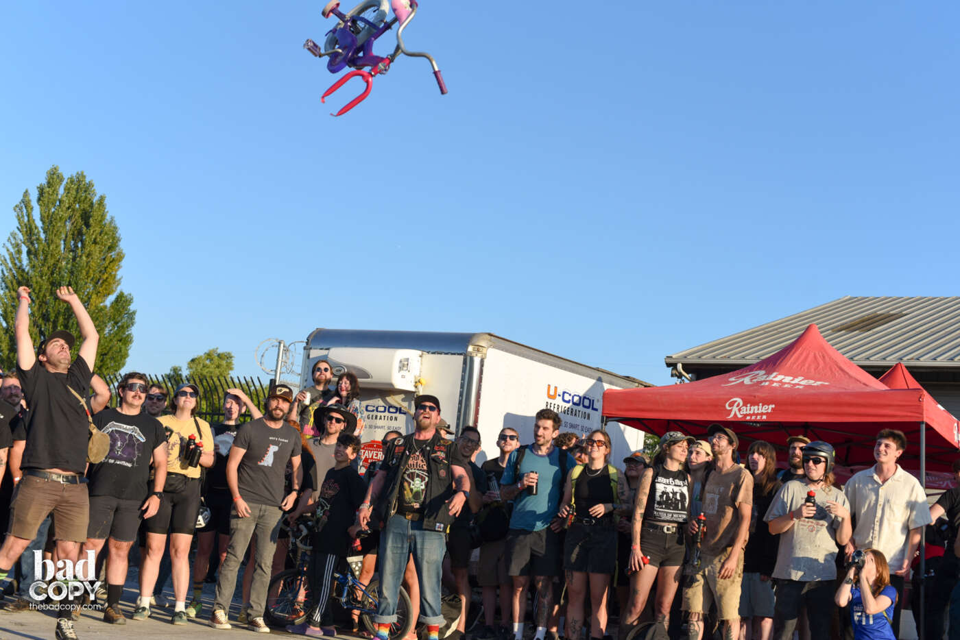 When we got a few Rainiers in us, we decided to walk around the party and check out what all these fellow weirdos were up to. From the moment we were all greeted upon arrival by a local party marching band there was no downtime for the senses. We witnessed high flying dare-devilry at the BMX expo (my favorite to photograph), leisurely yet competitive games of bicycle polo, live music, and when the sun went down the industrial park was graced by multiple fire dancers lighting up the crowd all while being encircled by couples on tandem bicycles. After spending some time in the play pen of custom built wonky bikes, some of which were too tall, others too short, hinged in the middle, and backward pedals we took in what I think was the main attraction of the party, the head-to-head games. Right off the rip we saw a vigorous opening of “save the baby/kill the baby” where a doll is propped up between two contestants facing each other riding at full speed to get there first and it’s one’s job to save the baby, and the other…well you can probably guess. Whoever gets there first has to do their job accordingly. The very first round resulted in what everyone in the crowd assumed to be a concussion or at least a hefty bonk, so from then on helmets were required. Other games included a tug of war where contestants had a length of bike tubes strapped around their shoulders and biked away from each other until there was a clear winner, and the night culminated in the main event of tall bike jousting. Fun for the whole family, really.