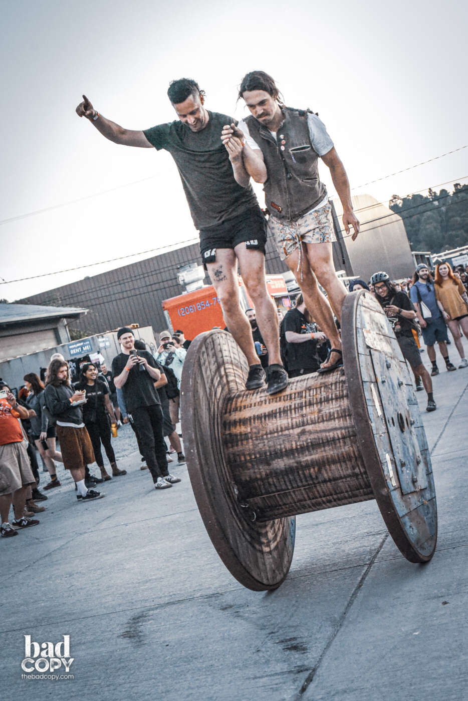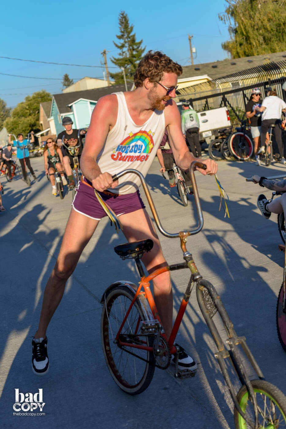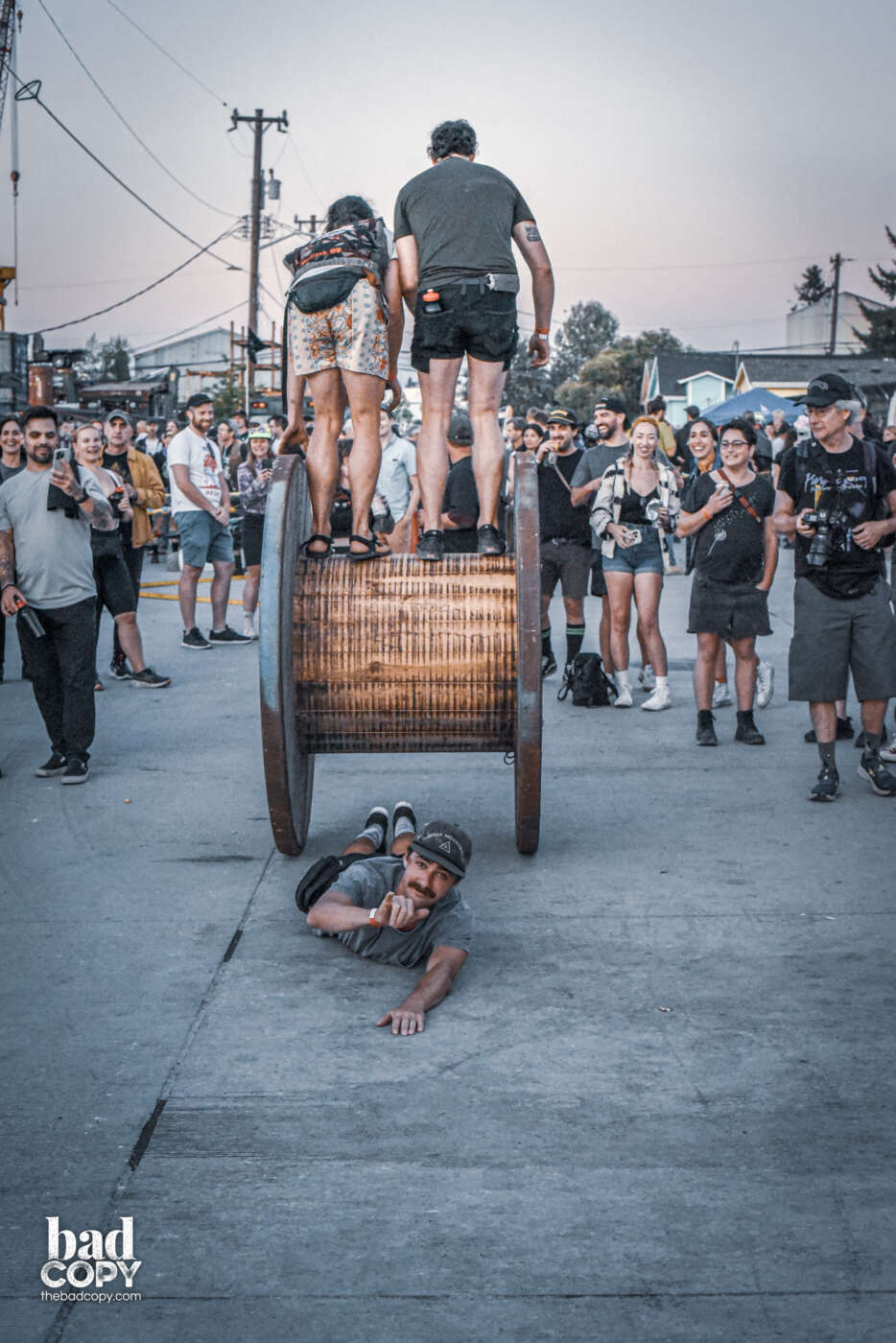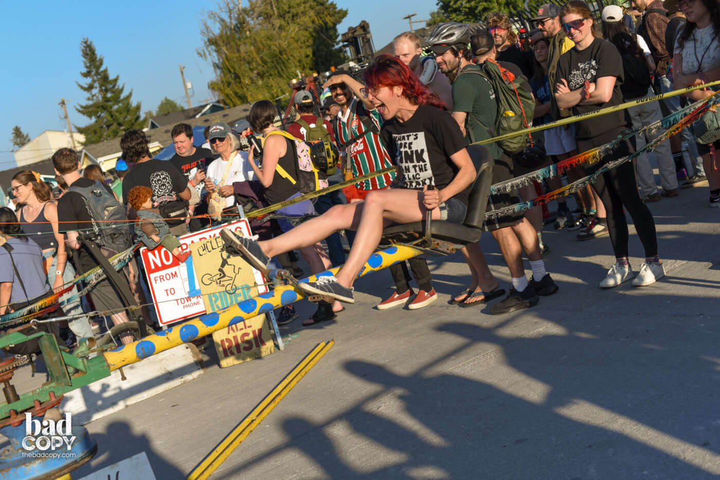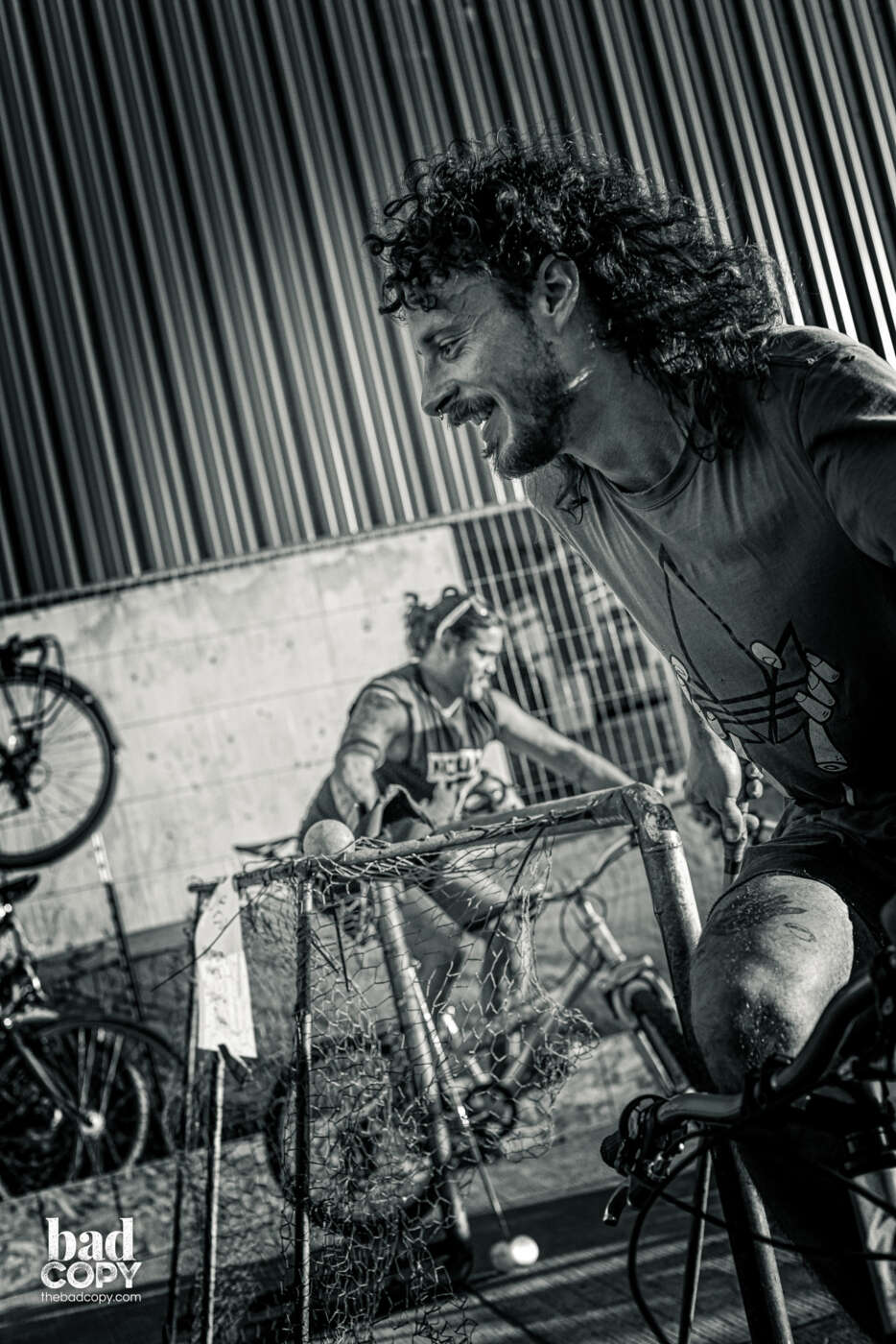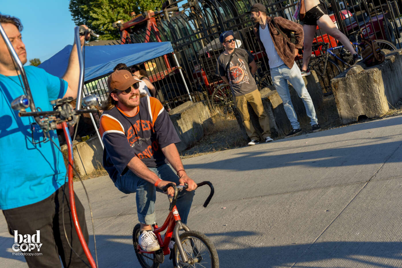 When we got a few Rainiers in us, we decided to walk around the party and check out what all these fellow weirdos were up to. From the moment we were all greeted upon arrival by a local party marching band there was no downtime for the senses. We witnessed high flying dare-devilry at the BMX expo (my favorite to photograph), leisurely yet competitive games of bicycle polo, live music, and when the sun went down the industrial park was graced by multiple fire dancers lighting up the crowd all while being encircled by couples on tandem bicycles. After spending some time in the play pen of custom built wonky bikes, some of which were too tall, others too short, hinged in the middle, and backward pedals we took in what I think was the main attraction of the party, the head-to-head games. Right off the rip we saw a vigorous opening of “save the baby/kill the baby” where a doll is propped up between two contestants facing each other riding at full speed to get there first and it’s one’s job to save the baby, and the other…well you can probably guess. Whoever gets there first has to do their job accordingly. The very first round resulted in what everyone in the crowd assumed to be a concussion or at least a hefty bonk, so from then on helmets were required. Other games included a tug of war where contestants had a length of bike tubes strapped around their shoulders and biked away from each other until there was a clear winner, and the night culminated in the main event of tall bike jousting. Fun for the whole family, really.