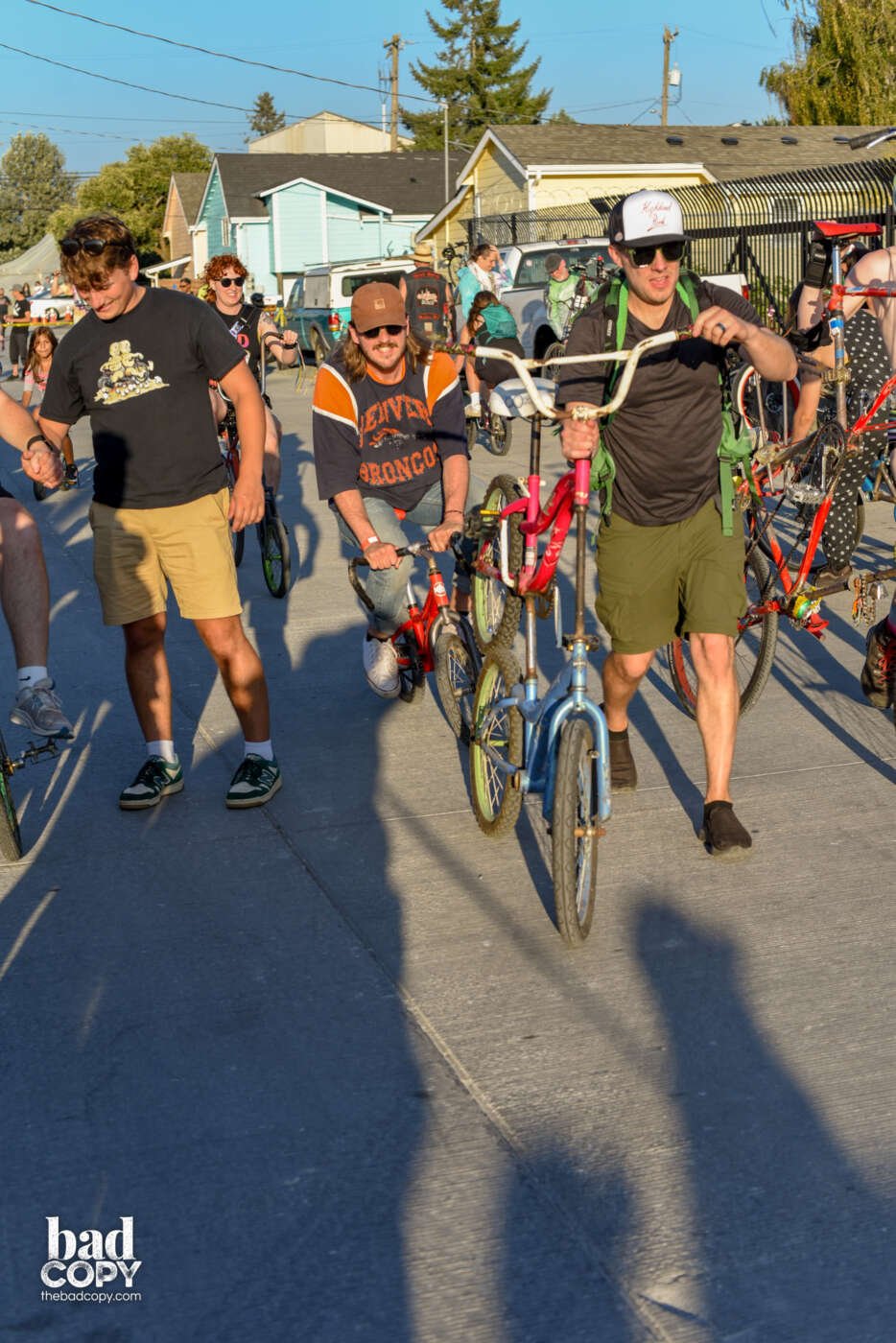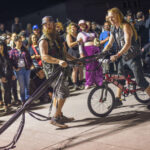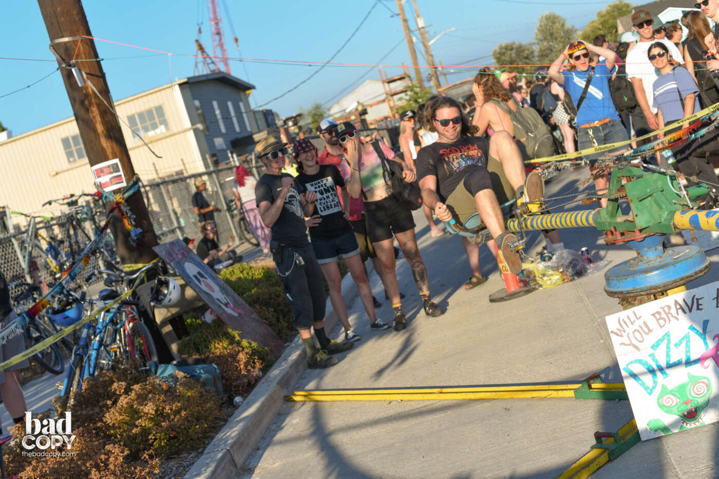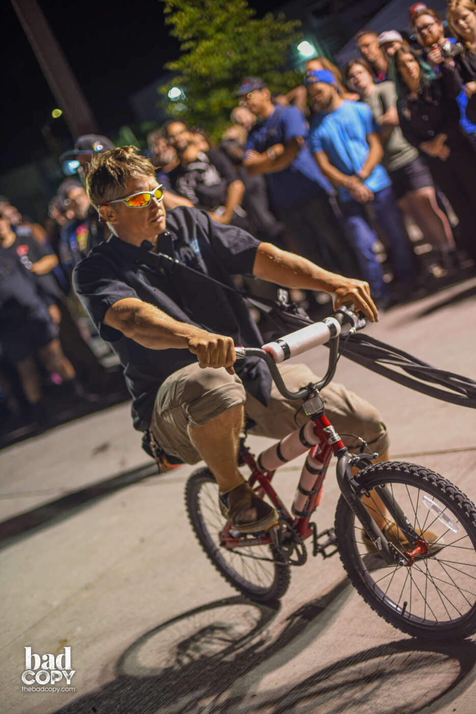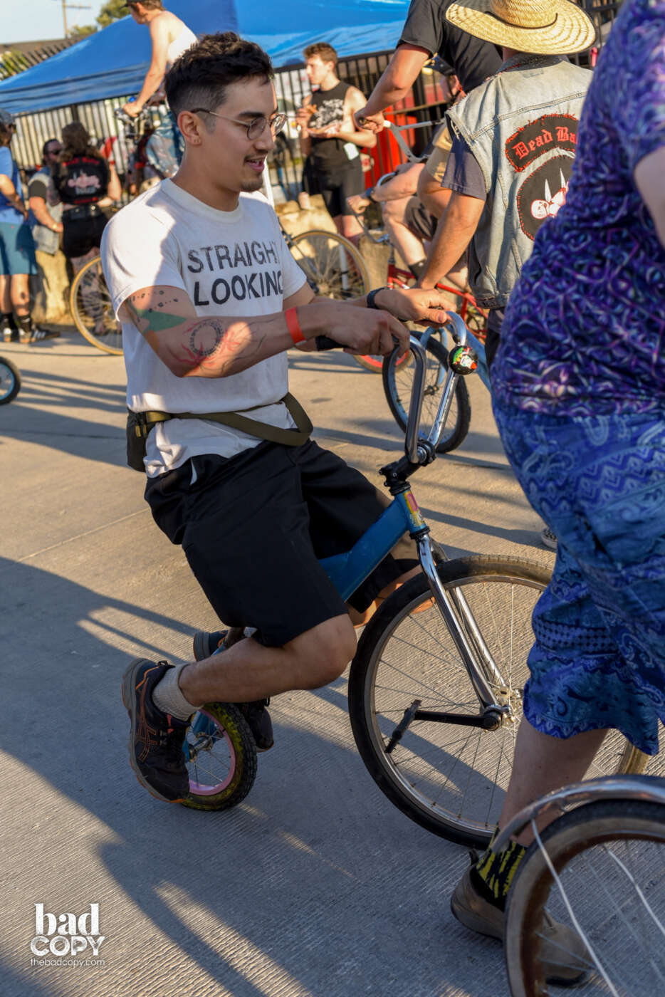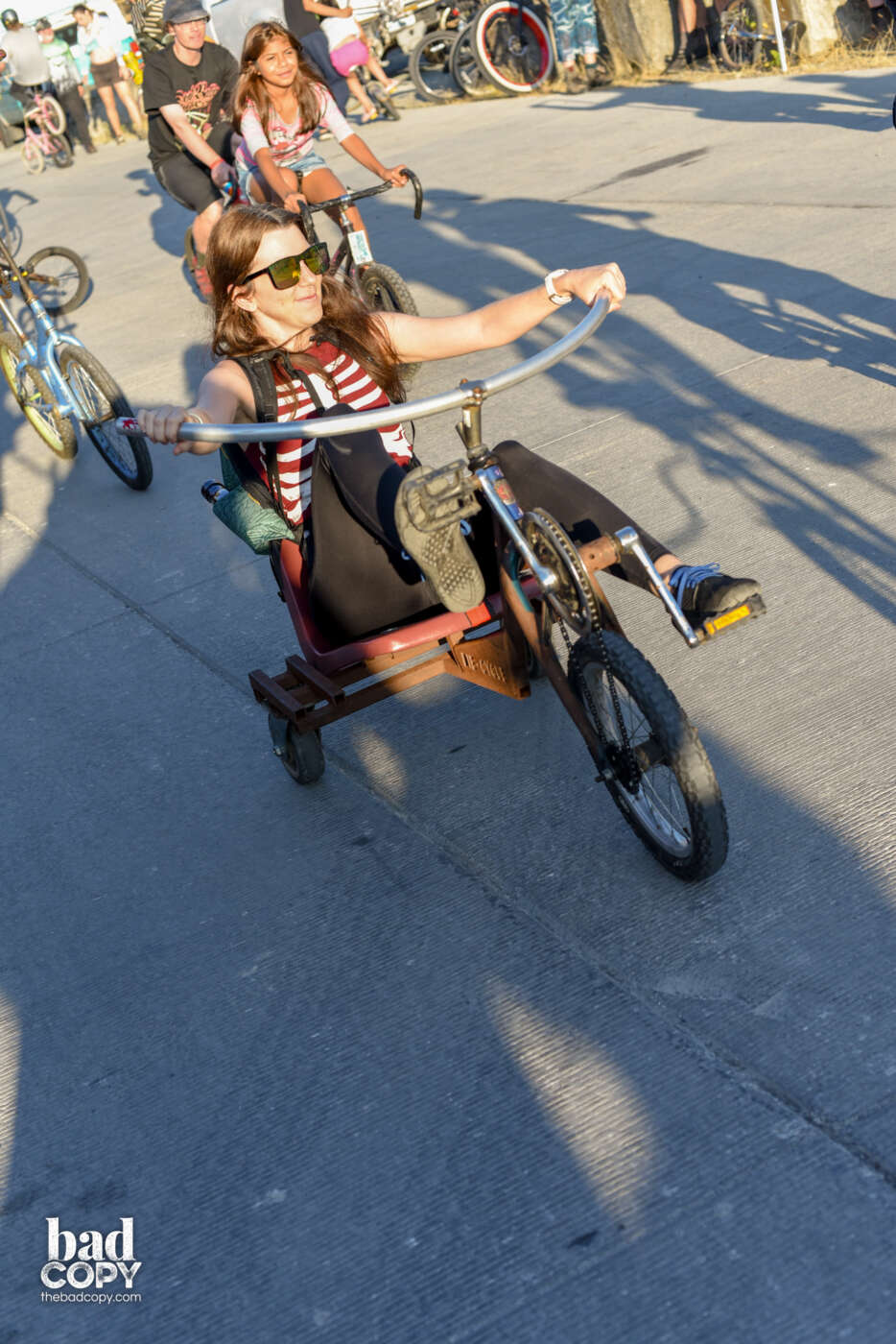 When we got a few Rainiers in us, we decided to walk around the party and check out what all these fellow weirdos were up to. From the moment we were all greeted upon arrival by a local party marching band there was no downtime for the senses. We witnessed high flying dare-devilry at the BMX expo (my favorite to photograph), leisurely yet competitive games of bicycle polo, live music, and when the sun went down the industrial park was graced by multiple fire dancers lighting up the crowd all while being encircled by couples on tandem bicycles. After spending some time in the play pen of custom built wonky bikes, some of which were too tall, others too short, hinged in the middle, and backward pedals we took in what I think was the main attraction of the party, the head-to-head games. Right off the rip we saw a vigorous opening of “save the baby/kill the baby” where a doll is propped up between two contestants facing each other riding at full speed to get there first and it’s one’s job to save the baby, and the other…well you can probably guess. Whoever gets there first has to do their job accordingly. The very first round resulted in what everyone in the crowd assumed to be a concussion or at least a hefty bonk, so from then on helmets were required. Other games included a tug of war where contestants had a length of bike tubes strapped around their shoulders and biked away from each other until there was a clear winner, and the night culminated in the main event of tall bike jousting. Fun for the whole family, really.