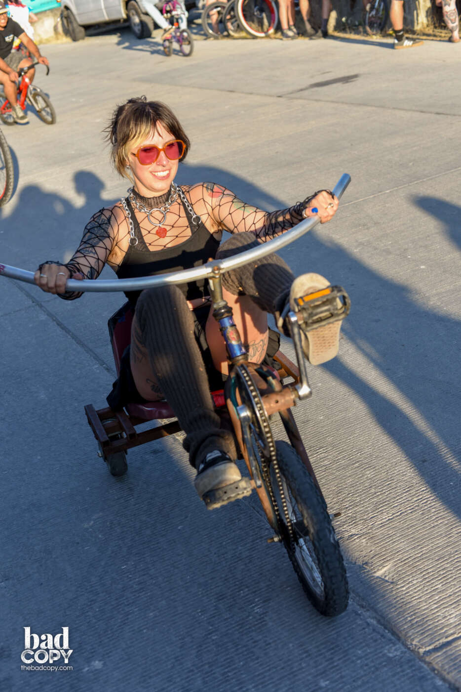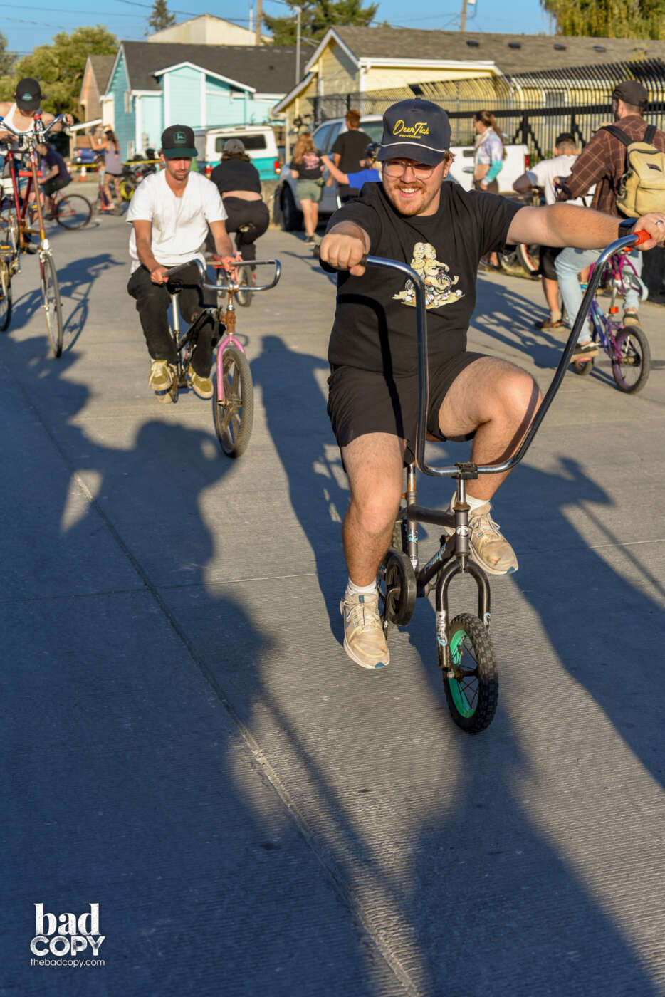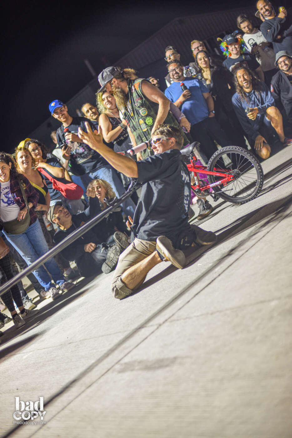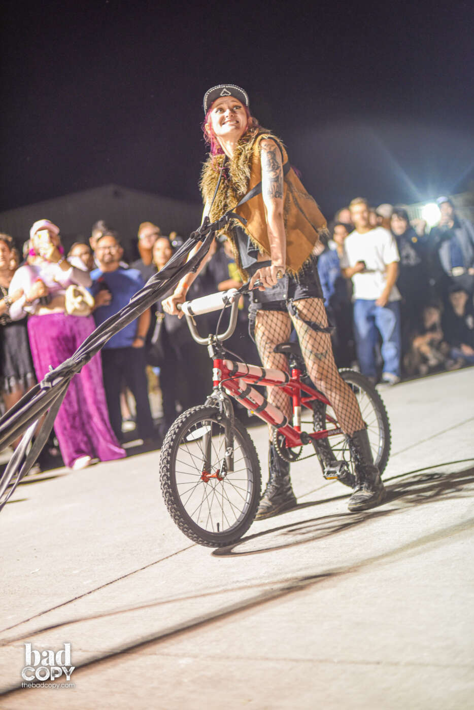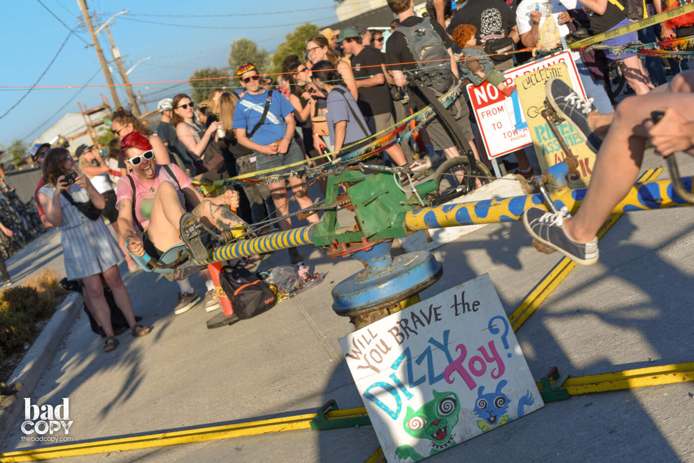 When we got a few Rainiers in us, we decided to walk around the party and check out what all these fellow weirdos were up to. From the moment we were all greeted upon arrival by a local party marching band there was no downtime for the senses. We witnessed high flying dare-devilry at the BMX expo (my favorite to photograph), leisurely yet competitive games of bicycle polo, live music, and when the sun went down the industrial park was graced by multiple fire dancers lighting up the crowd all while being encircled by couples on tandem bicycles. After spending some time in the play pen of custom built wonky bikes, some of which were too tall, others too short, hinged in the middle, and backward pedals we took in what I think was the main attraction of the party, the head-to-head games. Right off the rip we saw a vigorous opening of “save the baby/kill the baby” where a doll is propped up between two contestants facing each other riding at full speed to get there first and it’s one’s job to save the baby, and the other…well you can probably guess. Whoever gets there first has to do their job accordingly. The very first round resulted in what everyone in the crowd assumed to be a concussion or at least a hefty bonk, so from then on helmets were required. Other games included a tug of war where contestants had a length of bike tubes strapped around their shoulders and biked away from each other until there was a clear winner, and the night culminated in the main event of tall bike jousting. Fun for the whole family, really.