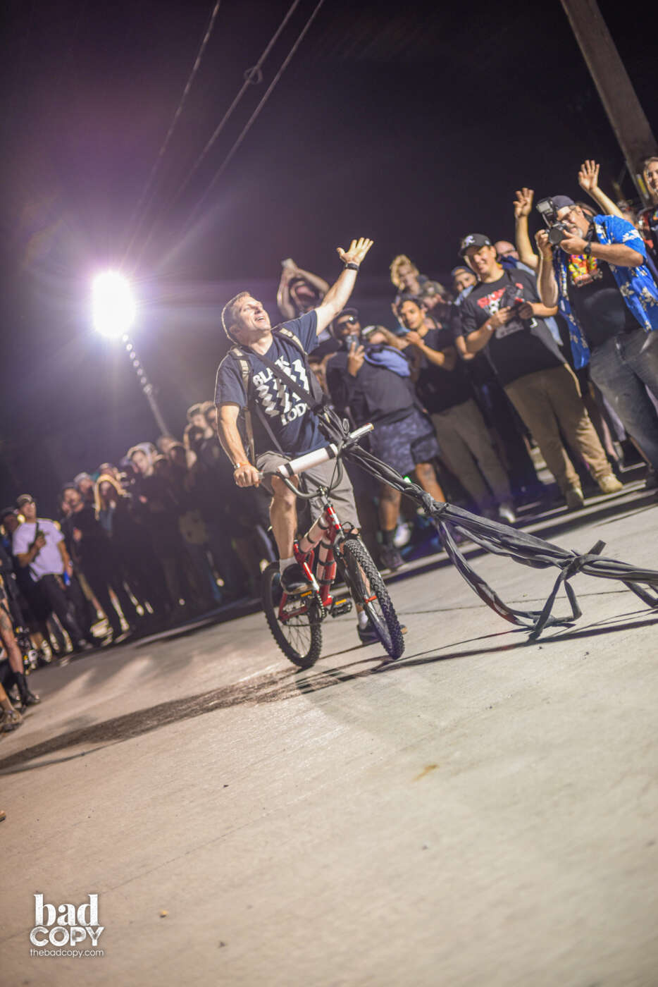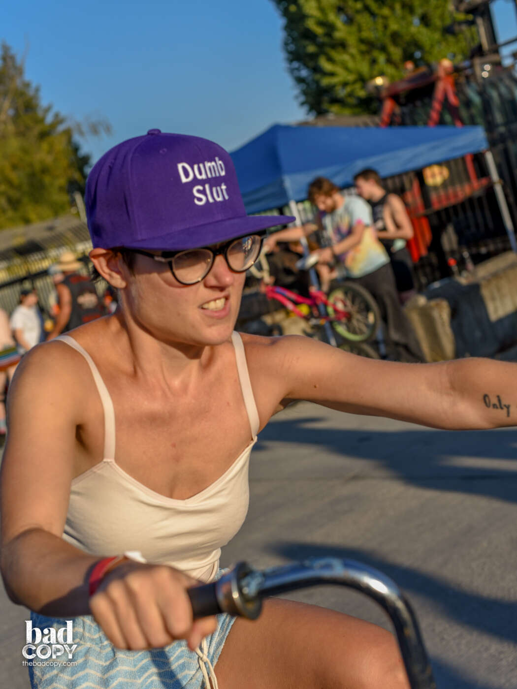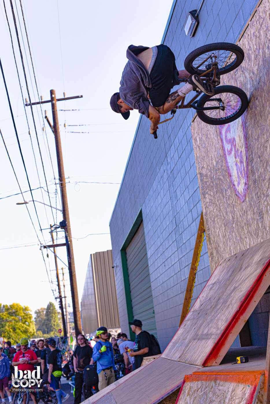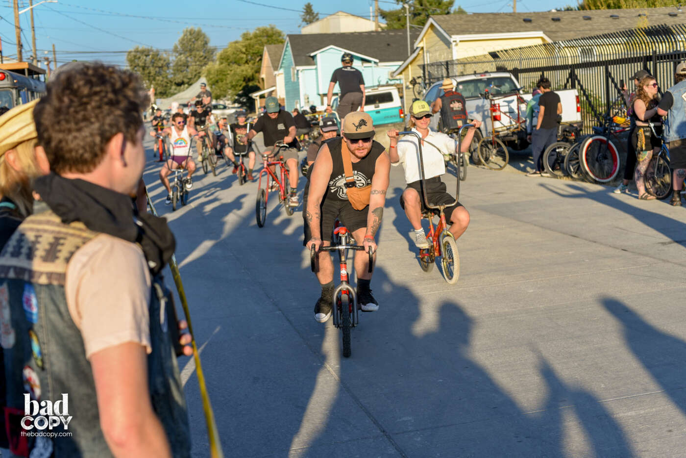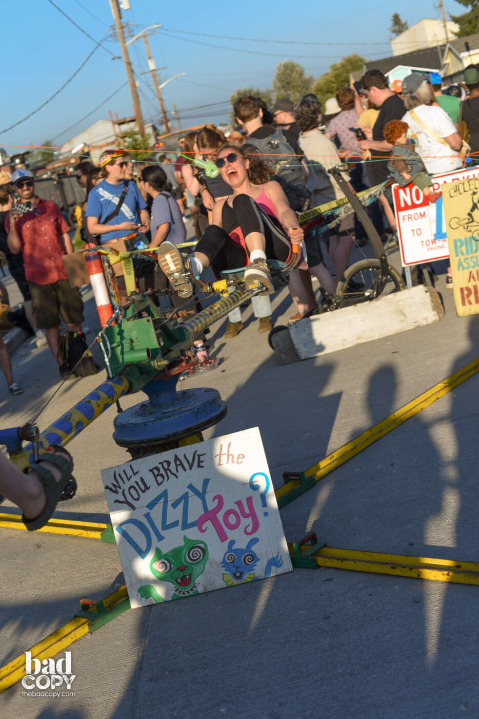 When we got a few Rainiers in us, we decided to walk around the party and check out what all these fellow weirdos were up to. From the moment we were all greeted upon arrival by a local party marching band there was no downtime for the senses. We witnessed high flying dare-devilry at the BMX expo (my favorite to photograph), leisurely yet competitive games of bicycle polo, live music, and when the sun went down the industrial park was graced by multiple fire dancers lighting up the crowd all while being encircled by couples on tandem bicycles. After spending some time in the play pen of custom built wonky bikes, some of which were too tall, others too short, hinged in the middle, and backward pedals we took in what I think was the main attraction of the party, the head-to-head games. Right off the rip we saw a vigorous opening of “save the baby/kill the baby” where a doll is propped up between two contestants facing each other riding at full speed to get there first and it’s one’s job to save the baby, and the other…well you can probably guess. Whoever gets there first has to do their job accordingly. The very first round resulted in what everyone in the crowd assumed to be a concussion or at least a hefty bonk, so from then on helmets were required. Other games included a tug of war where contestants had a length of bike tubes strapped around their shoulders and biked away from each other until there was a clear winner, and the night culminated in the main event of tall bike jousting. Fun for the whole family, really.