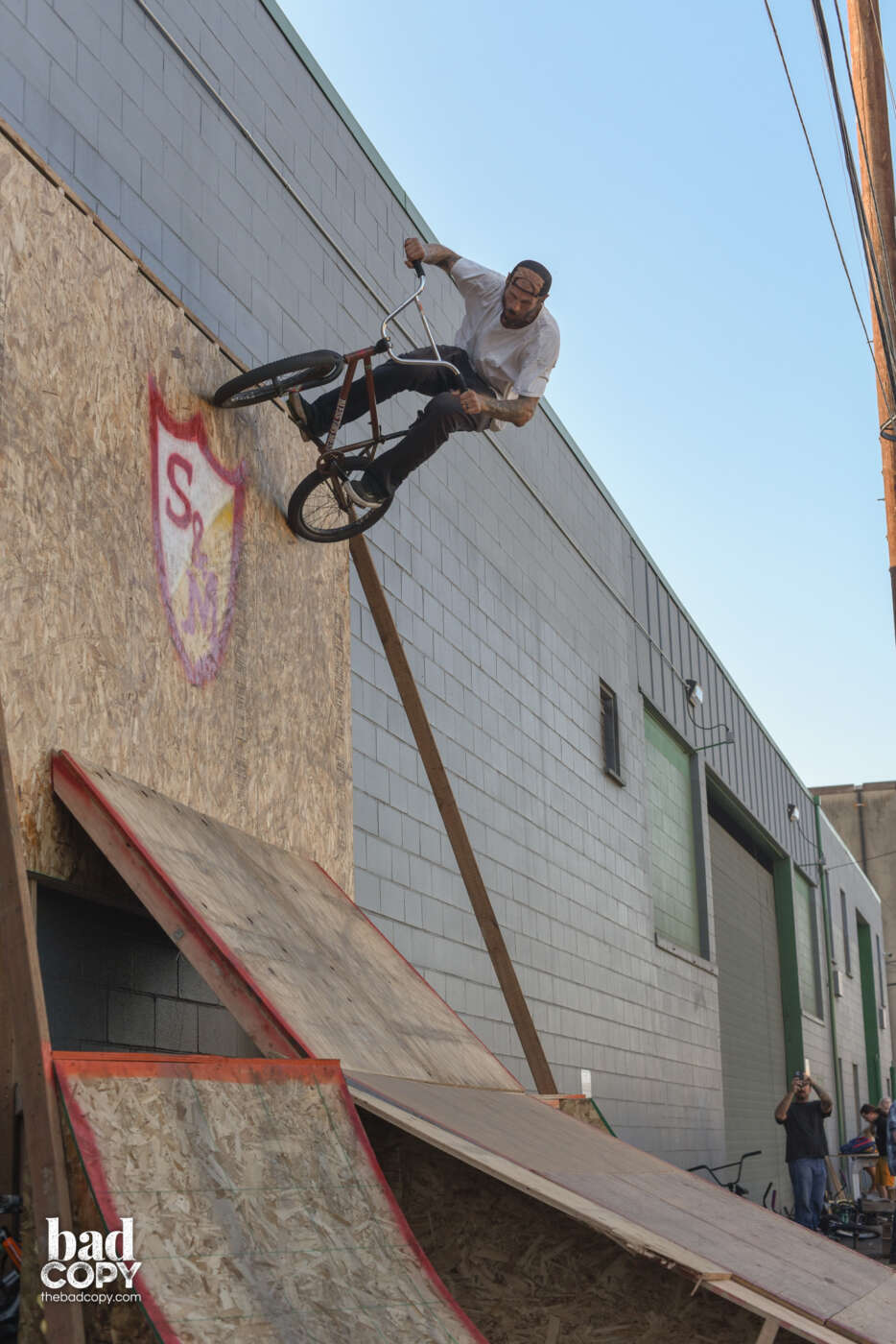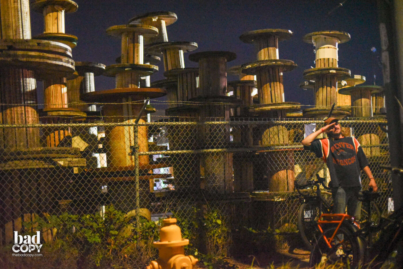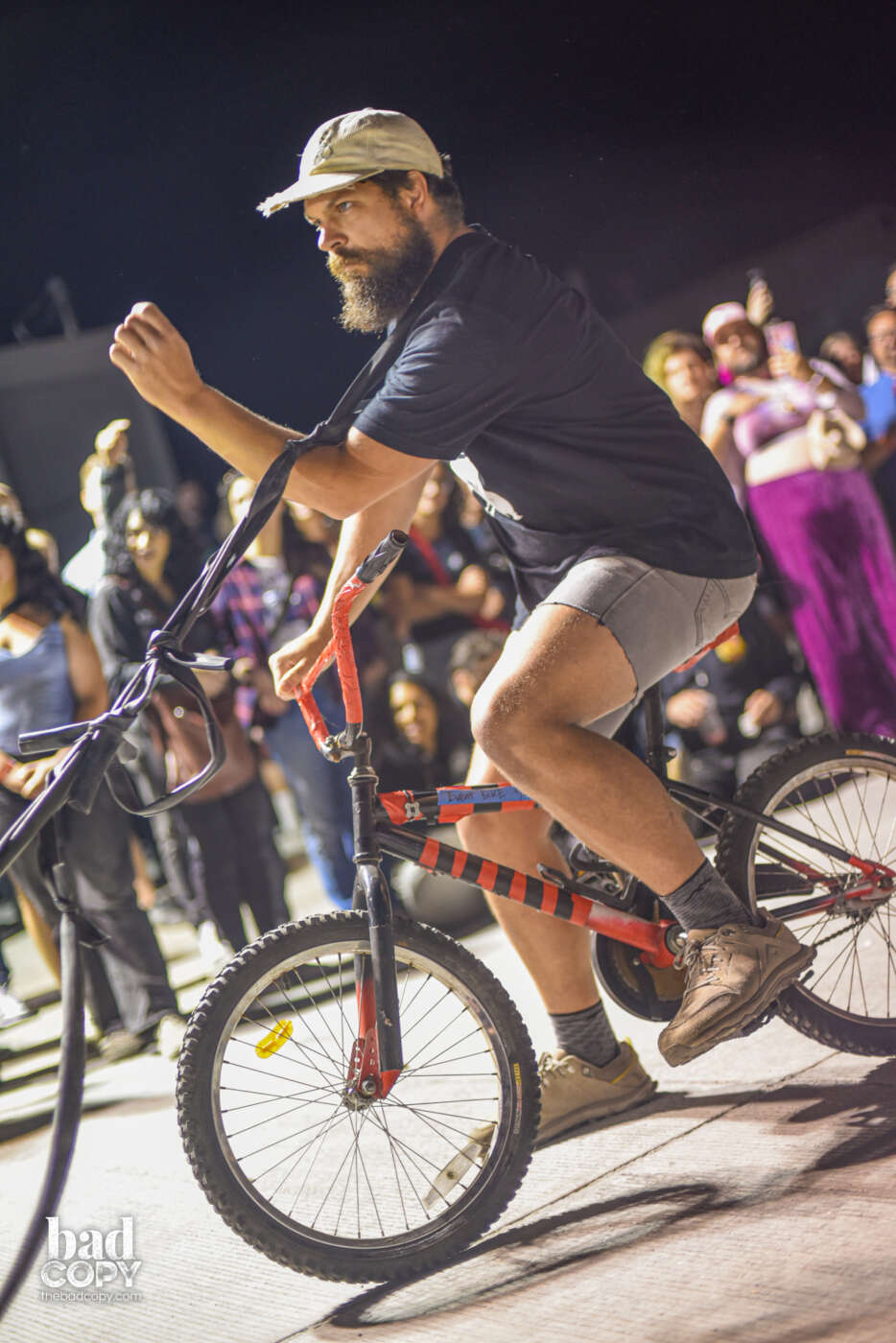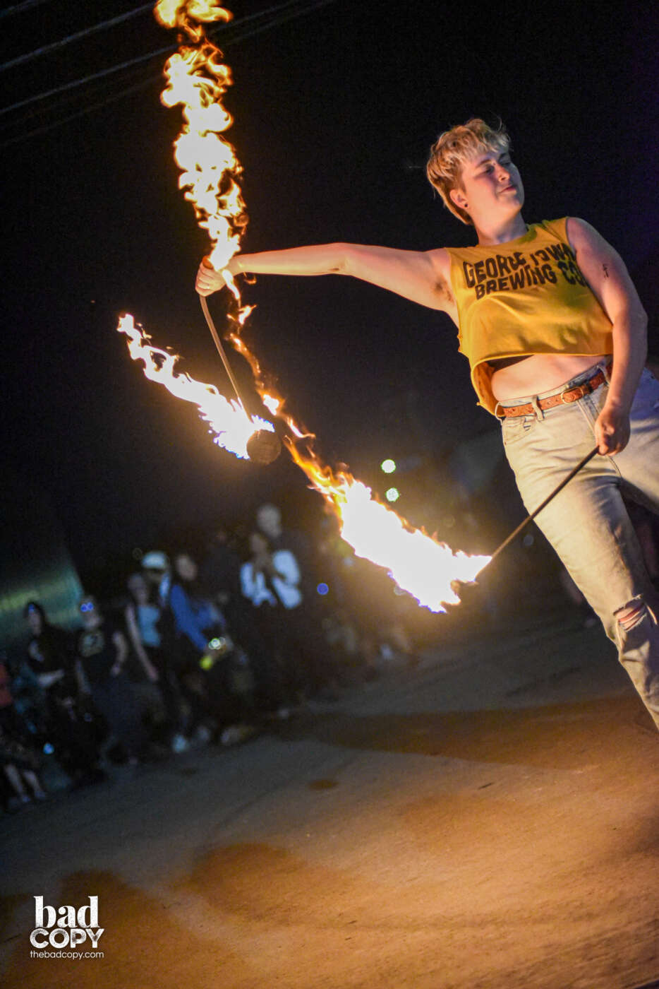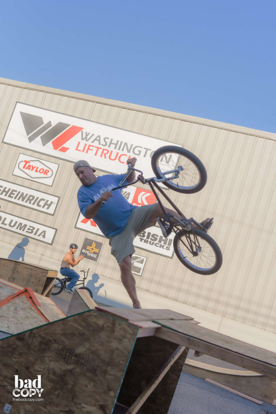 When we got a few Rainiers in us, we decided to walk around the party and check out what all these fellow weirdos were up to. From the moment we were all greeted upon arrival by a local party marching band there was no downtime for the senses. We witnessed high flying dare-devilry at the BMX expo (my favorite to photograph), leisurely yet competitive games of bicycle polo, live music, and when the sun went down the industrial park was graced by multiple fire dancers lighting up the crowd all while being encircled by couples on tandem bicycles. After spending some time in the play pen of custom built wonky bikes, some of which were too tall, others too short, hinged in the middle, and backward pedals we took in what I think was the main attraction of the party, the head-to-head games. Right off the rip we saw a vigorous opening of “save the baby/kill the baby” where a doll is propped up between two contestants facing each other riding at full speed to get there first and it’s one’s job to save the baby, and the other…well you can probably guess. Whoever gets there first has to do their job accordingly. The very first round resulted in what everyone in the crowd assumed to be a concussion or at least a hefty bonk, so from then on helmets were required. Other games included a tug of war where contestants had a length of bike tubes strapped around their shoulders and biked away from each other until there was a clear winner, and the night culminated in the main event of tall bike jousting. Fun for the whole family, really.