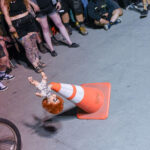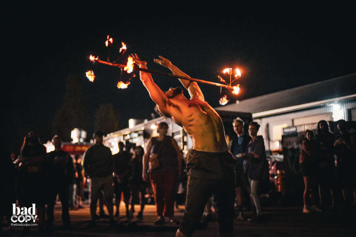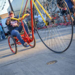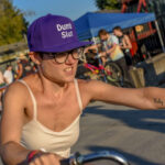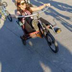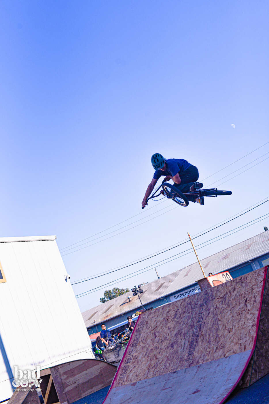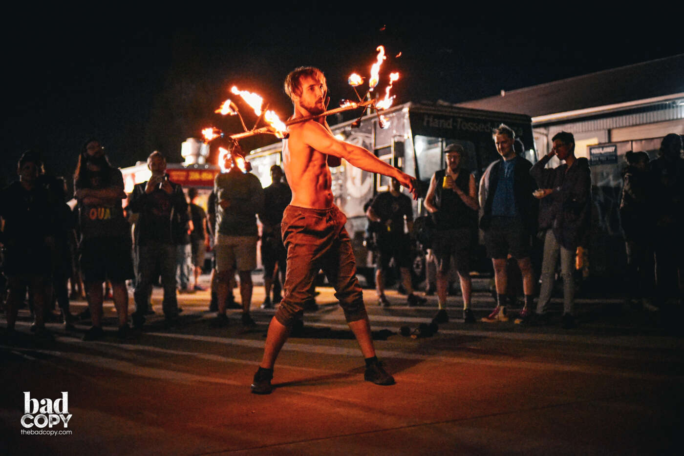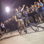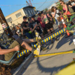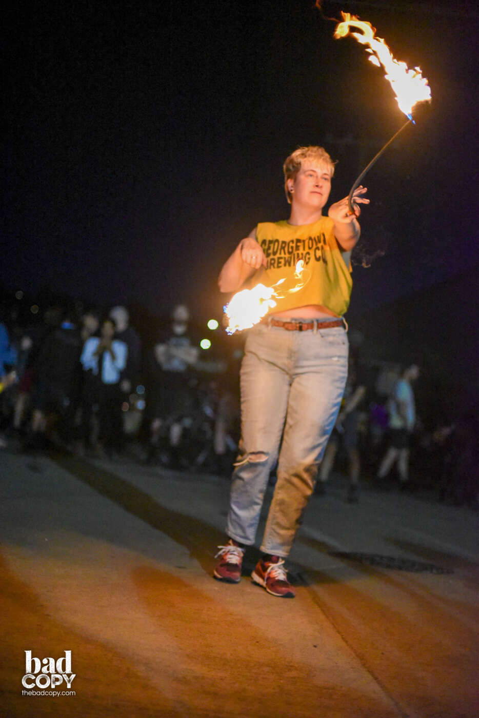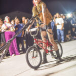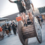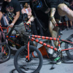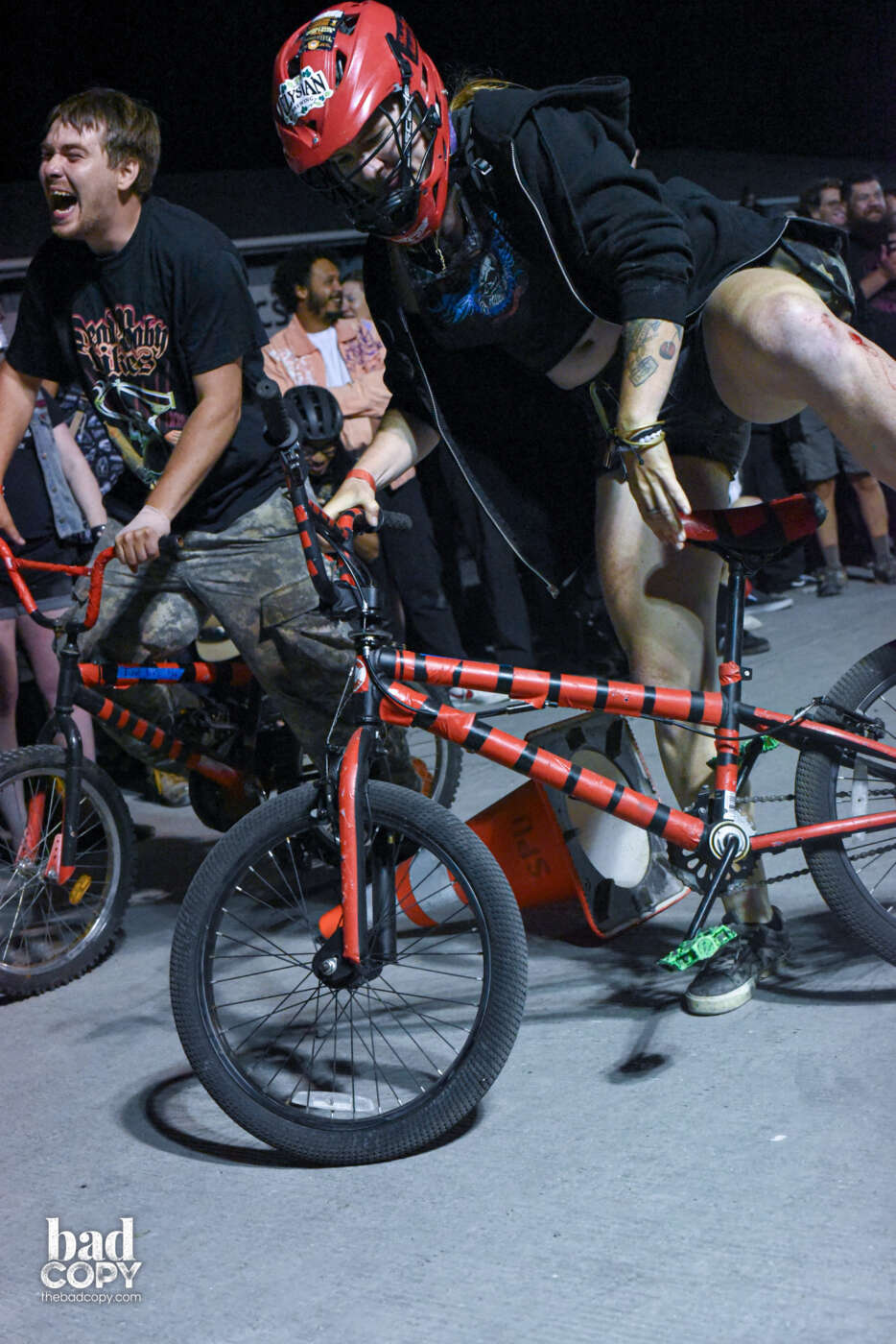 When we got a few Rainiers in us, we decided to walk around the party and check out what all these fellow weirdos were up to. From the moment we were all greeted upon arrival by a local party marching band there was no downtime for the senses. We witnessed high flying dare-devilry at the BMX expo (my favorite to photograph), leisurely yet competitive games of bicycle polo, live music, and when the sun went down the industrial park was graced by multiple fire dancers lighting up the crowd all while being encircled by couples on tandem bicycles. After spending some time in the play pen of custom built wonky bikes, some of which were too tall, others too short, hinged in the middle, and backward pedals we took in what I think was the main attraction of the party, the head-to-head games. Right off the rip we saw a vigorous opening of “save the baby/kill the baby” where a doll is propped up between two contestants facing each other riding at full speed to get there first and it’s one’s job to save the baby, and the other…well you can probably guess. Whoever gets there first has to do their job accordingly. The very first round resulted in what everyone in the crowd assumed to be a concussion or at least a hefty bonk, so from then on helmets were required. Other games included a tug of war where contestants had a length of bike tubes strapped around their shoulders and biked away from each other until there was a clear winner, and the night culminated in the main event of tall bike jousting. Fun for the whole family, really.