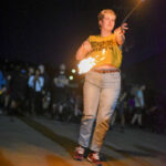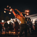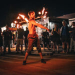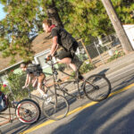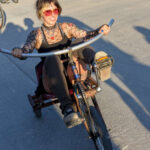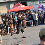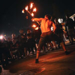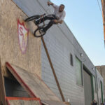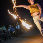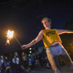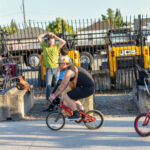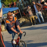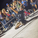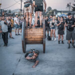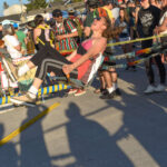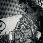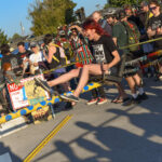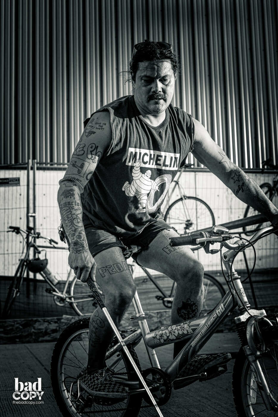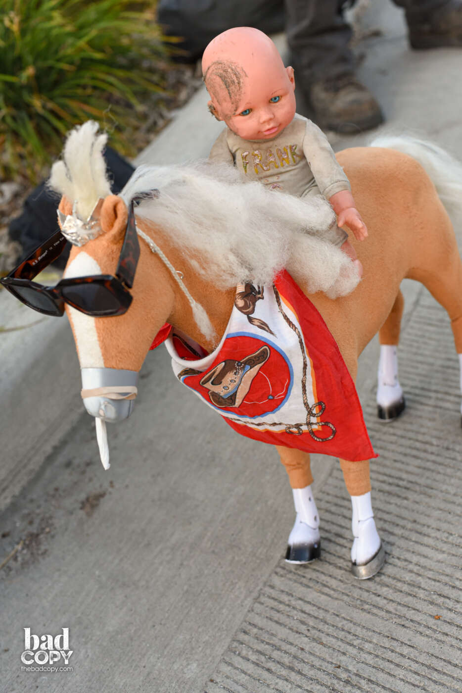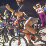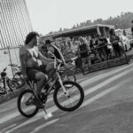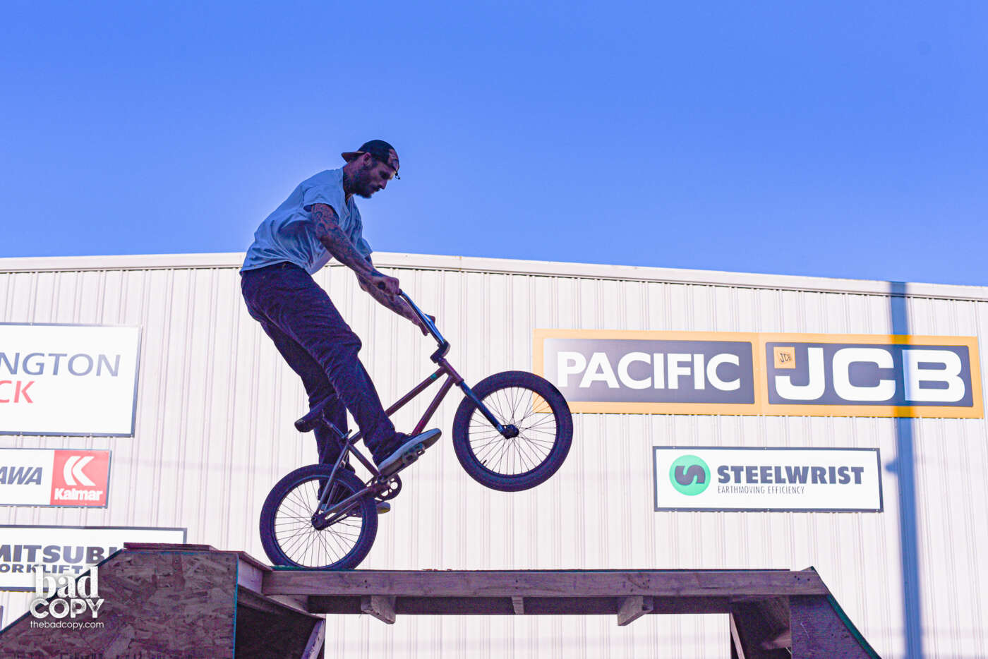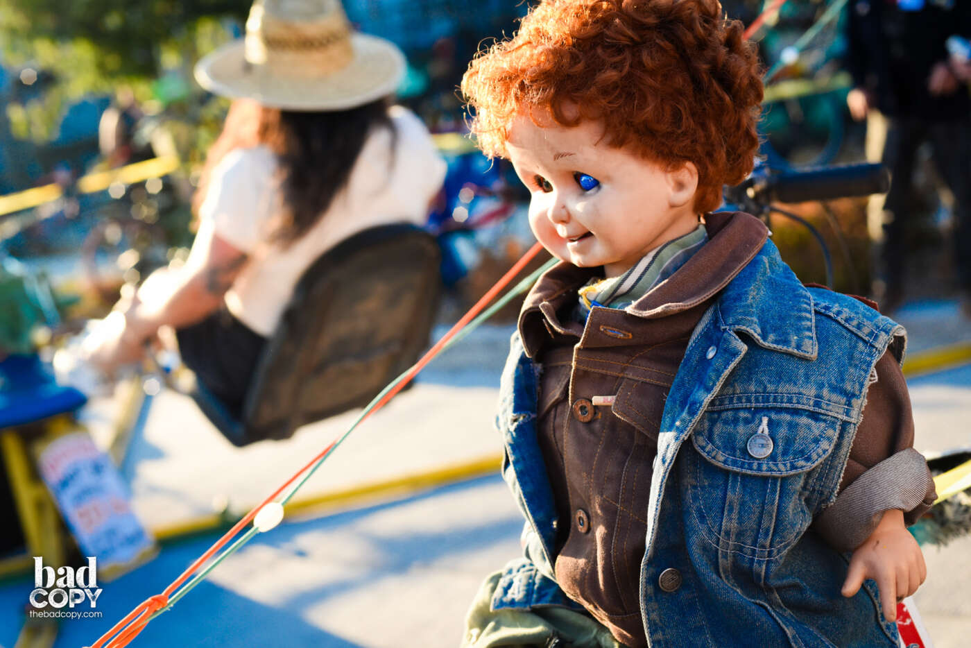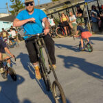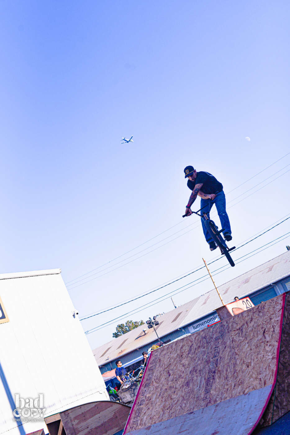 When we got a few Rainiers in us, we decided to walk around the party and check out what all these fellow weirdos were up to. From the moment we were all greeted upon arrival by a local party marching band there was no downtime for the senses. We witnessed high flying dare-devilry at the BMX expo (my favorite to photograph), leisurely yet competitive games of bicycle polo, live music, and when the sun went down the industrial park was graced by multiple fire dancers lighting up the crowd all while being encircled by couples on tandem bicycles. After spending some time in the play pen of custom built wonky bikes, some of which were too tall, others too short, hinged in the middle, and backward pedals we took in what I think was the main attraction of the party, the head-to-head games. Right off the rip we saw a vigorous opening of “save the baby/kill the baby” where a doll is propped up between two contestants facing each other riding at full speed to get there first and it’s one’s job to save the baby, and the other…well you can probably guess. Whoever gets there first has to do their job accordingly. The very first round resulted in what everyone in the crowd assumed to be a concussion or at least a hefty bonk, so from then on helmets were required. Other games included a tug of war where contestants had a length of bike tubes strapped around their shoulders and biked away from each other until there was a clear winner, and the night culminated in the main event of tall bike jousting. Fun for the whole family, really.