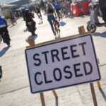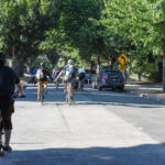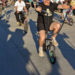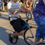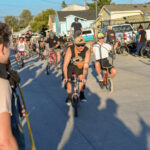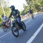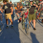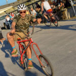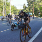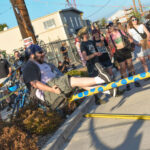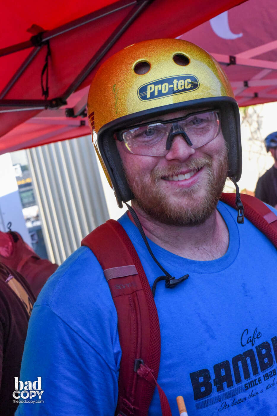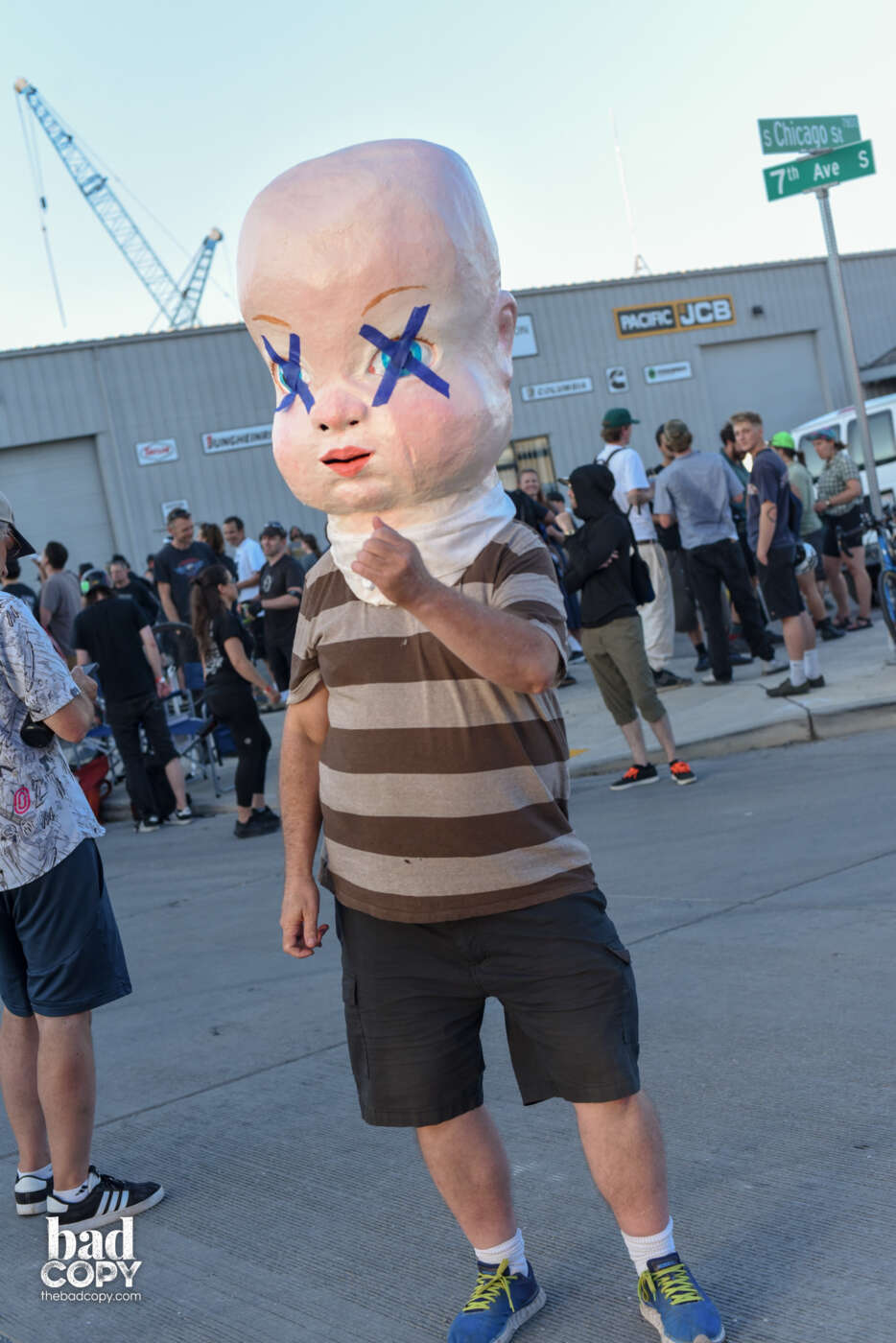 Just as I was beginning to second guess whether I took the wrong route down, the silence was broken by a raucous symphony of spokes and sprockets bearing down on me around the bend. I found myself a suitable spot to hunker down and attempt to capture the sights of nearly 1,000 cyclists barreling through busy intersections on bicycles as eclectic as the racers themselves. I witnessed everything from your standard single speed cruisers to custom fabricated monstrosities as tall as two bikes stacked together. In fact, I think they were just two bikes welded together. One rider that really stood out to me was a gentleman on a pseudo penny farthing (think big wheel/little wheel) yelling “NO BRAKES.” To this day, I can’t figure out if that was a warning in regards to his rig or a command to the riders around him. Once the parade of pedalers was nearly past I decided that I couldn’t miss out on the experience of joining in on the high-speed fun with all of the other adrenaline junkies. So I strapped my camera in, mounted up, and joined what felt like a school of salmon in an asphalt stream towards Dead Baby HQ.